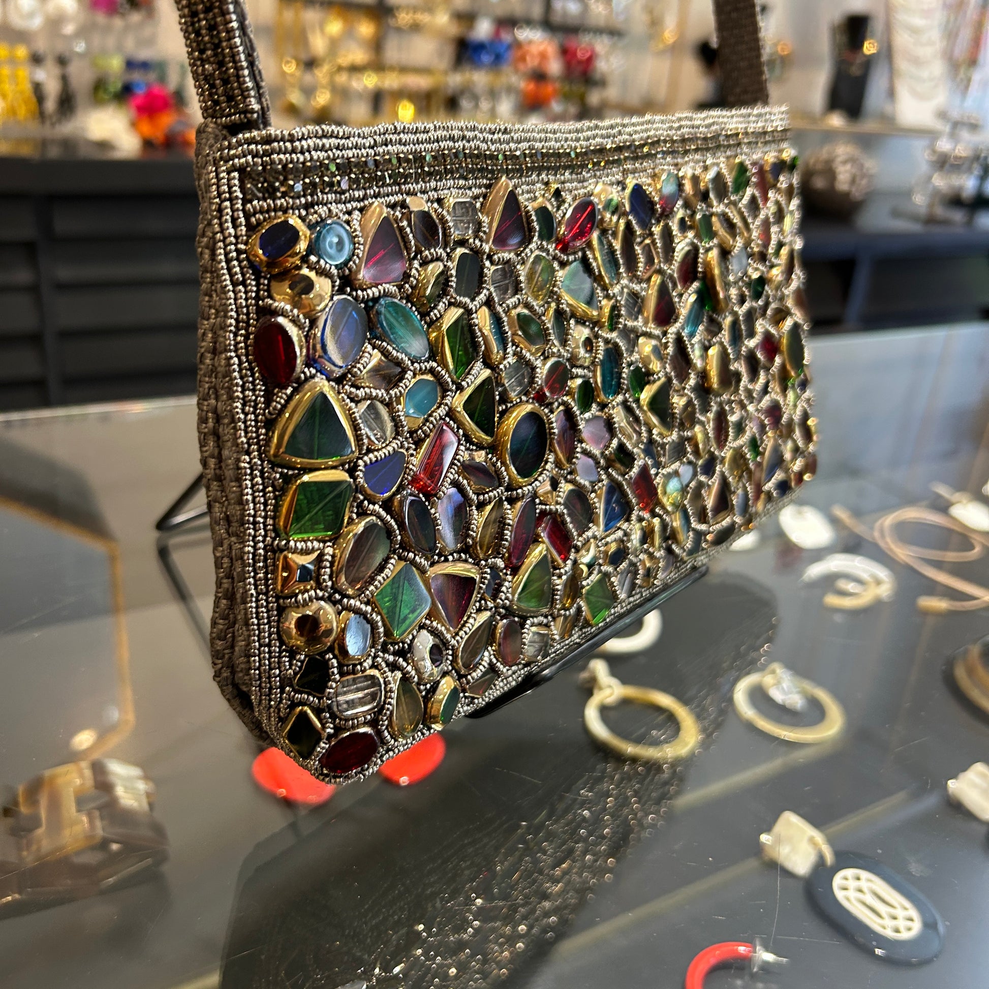 Cartera bordada con piedras multicolor