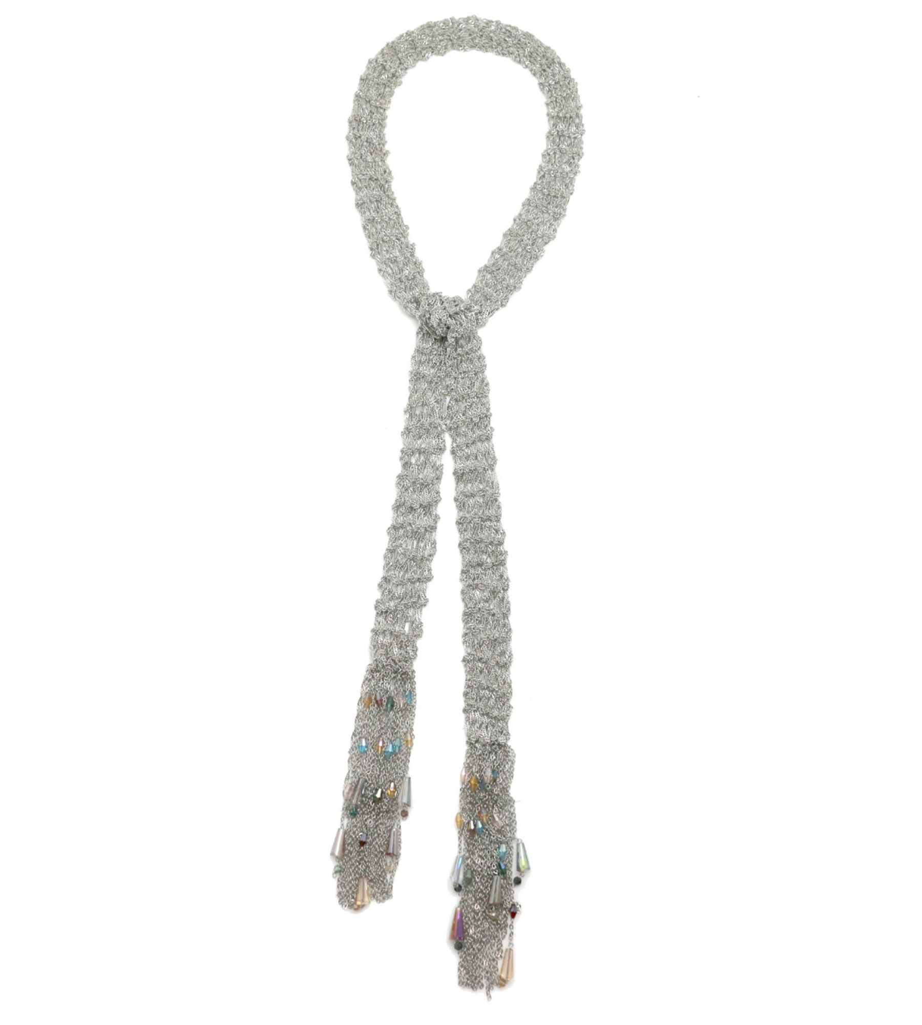 Collar tipo cobatero, que podés usar de muchas formas, hecho en cadenas super finas de acero entrelazada finalizada en cristales de colores.
