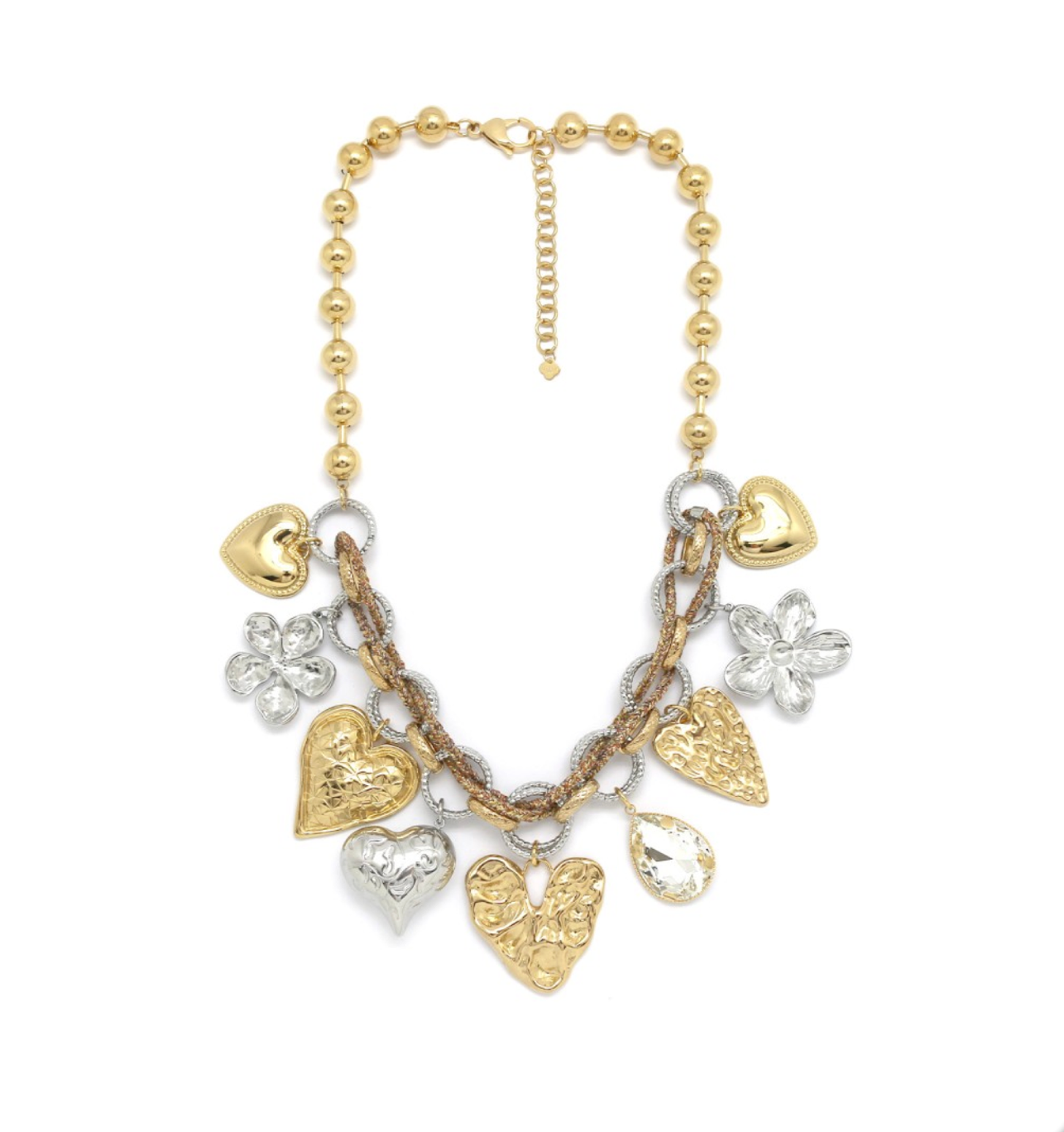 Collar de muchos dijes en formas de corazones dorados y plateados con detalles en cristal e hilo marrón, sobre cadena de acero dorada de altísima calidad.