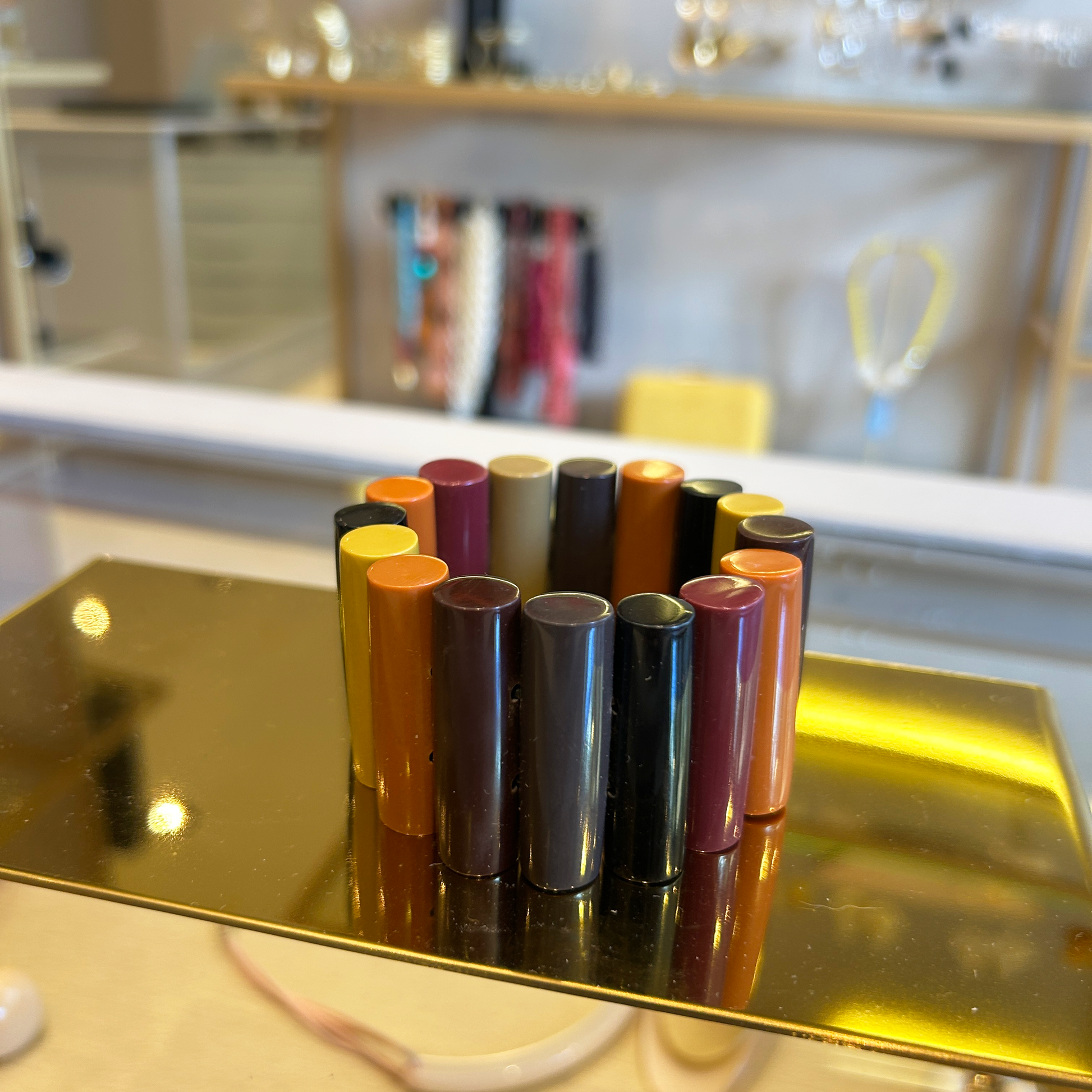 Pulsera hecha en pizas de resina tubulares en color marron, negro, bordo, mostaza y brick