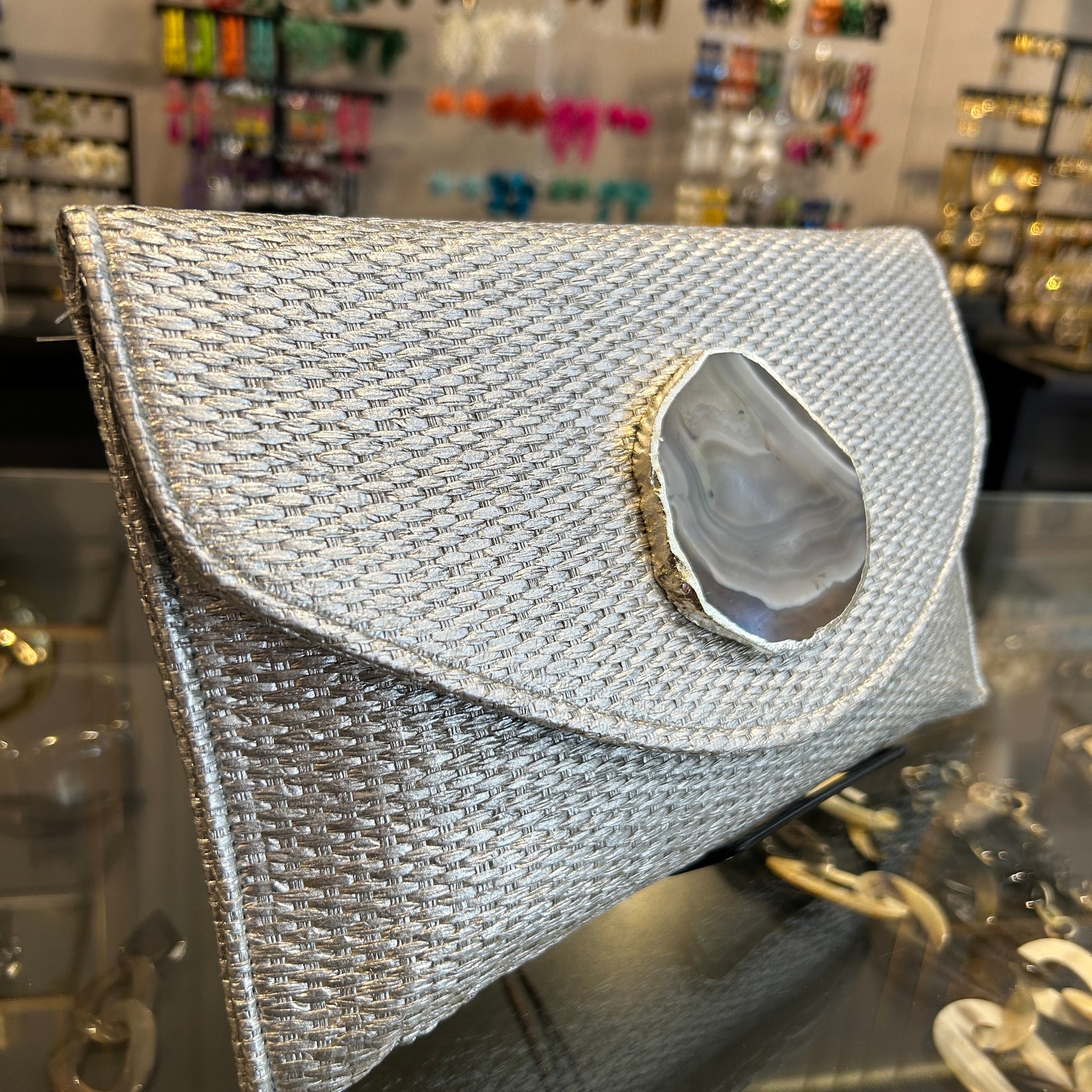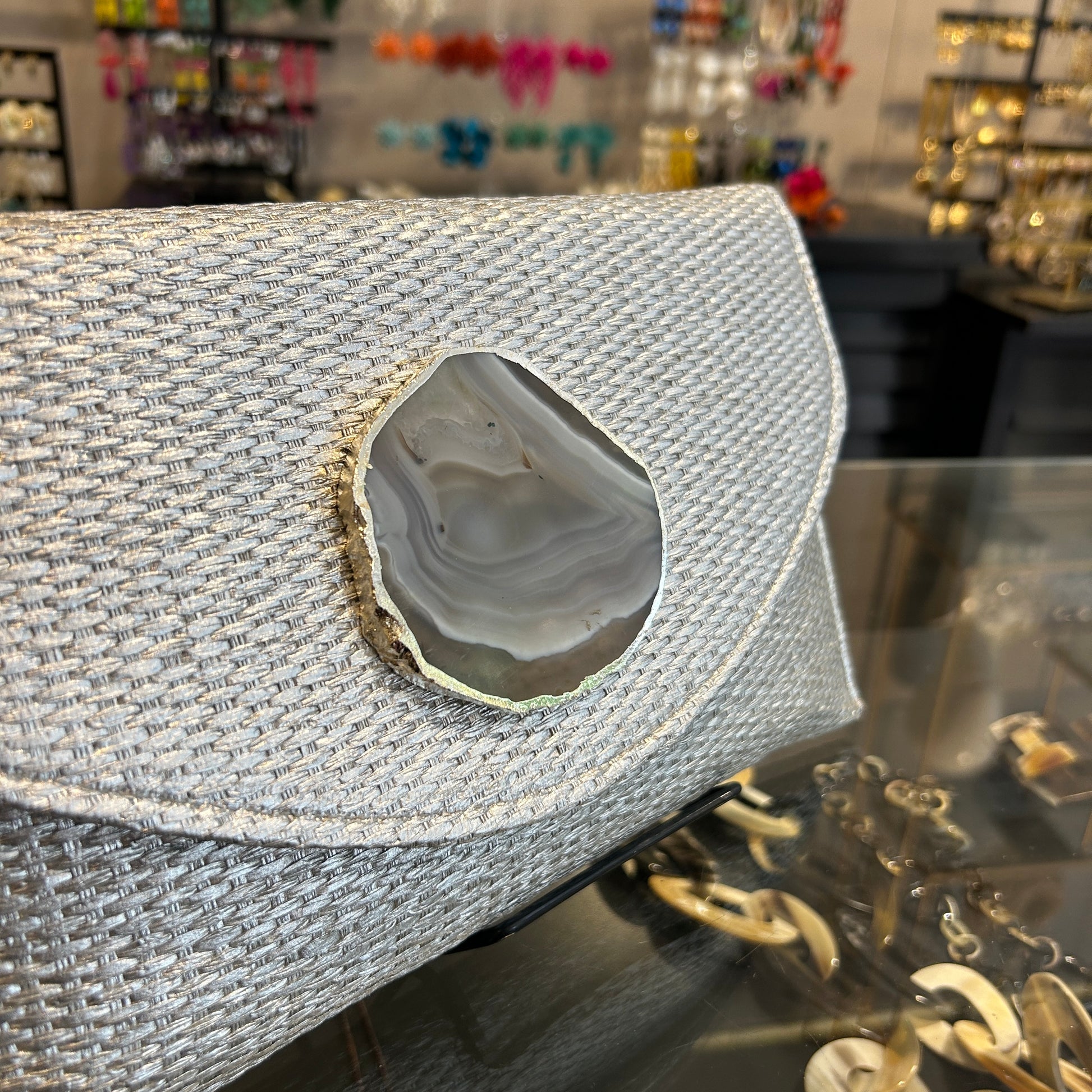 Sobre hecho artesanalmente en la India, en tejido tipo rafia plateado con con aplique de piedra ágata a tono.