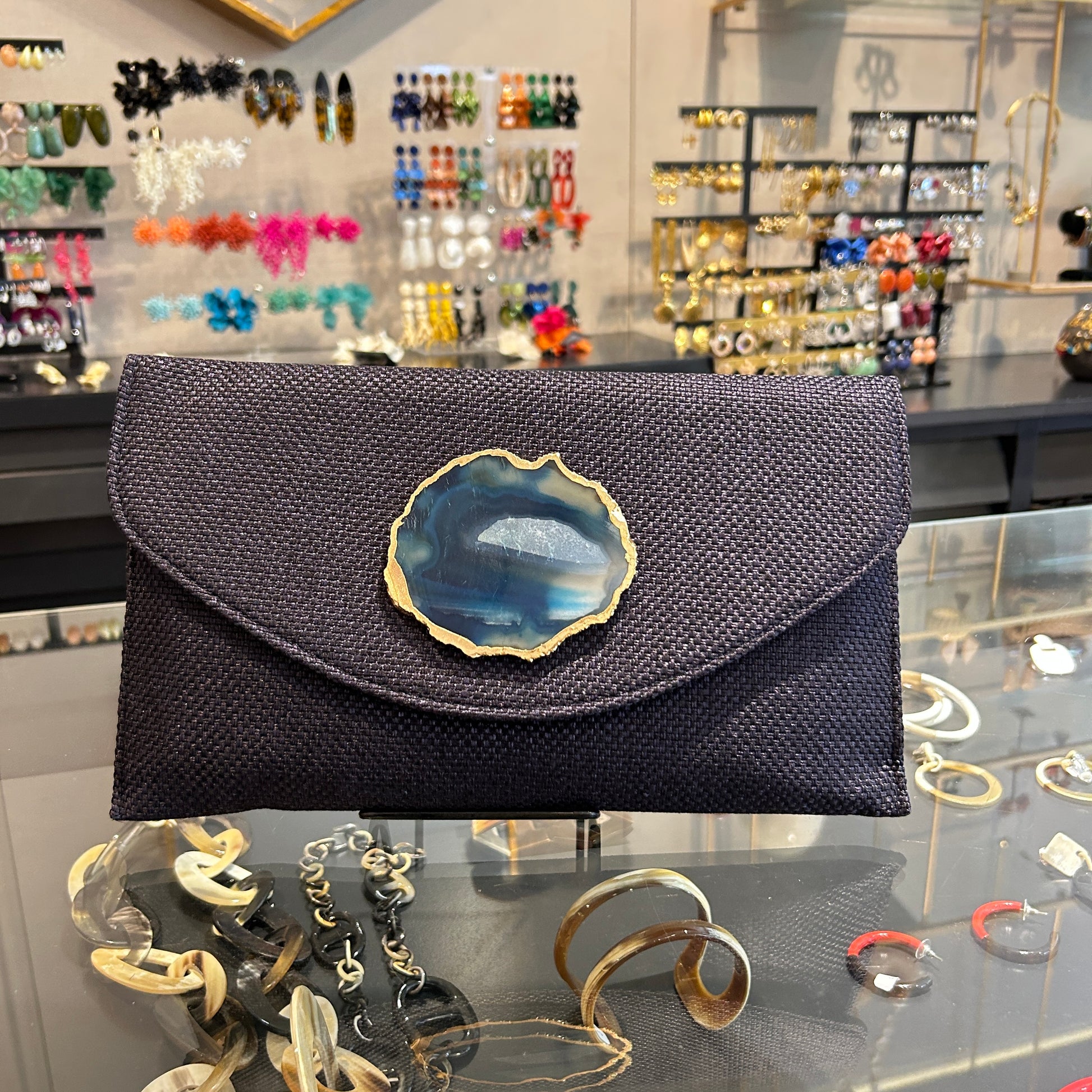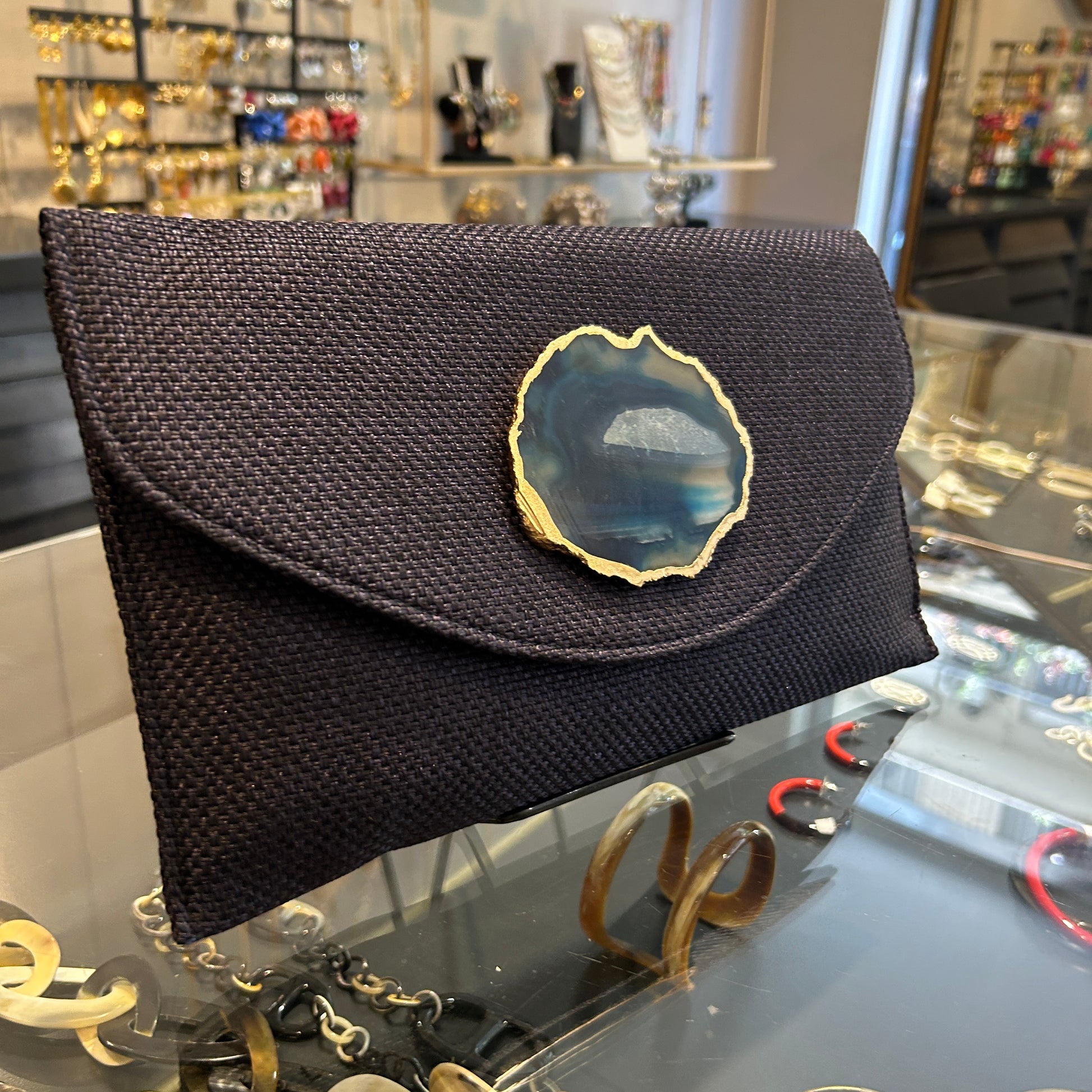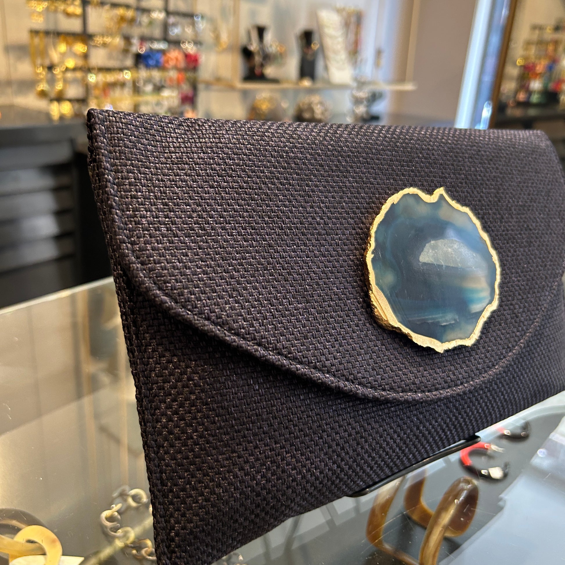 Sobre hecho artesanalmente en la India, en tejido color azul marino con con aplique de piedra ágata a tono.