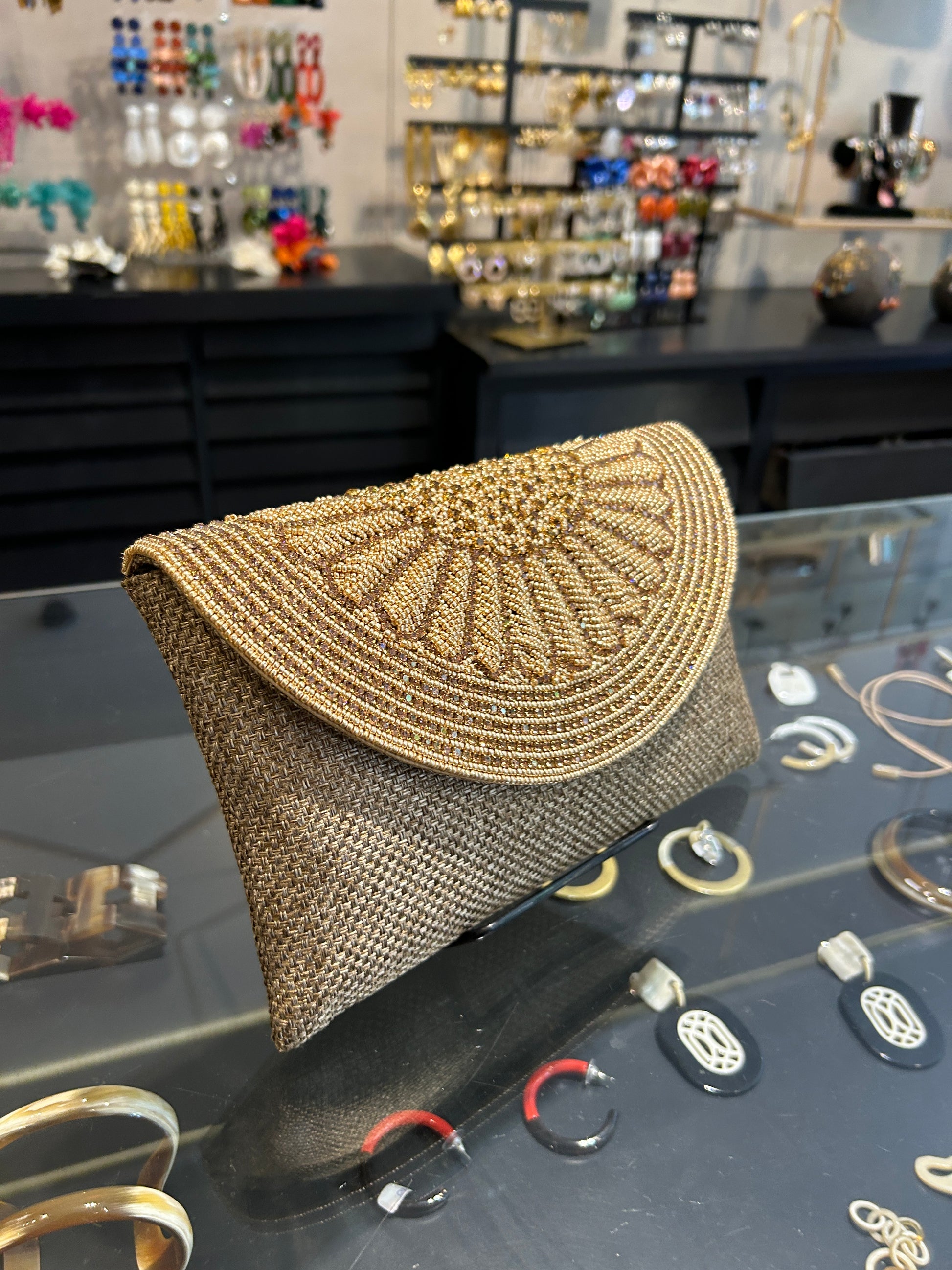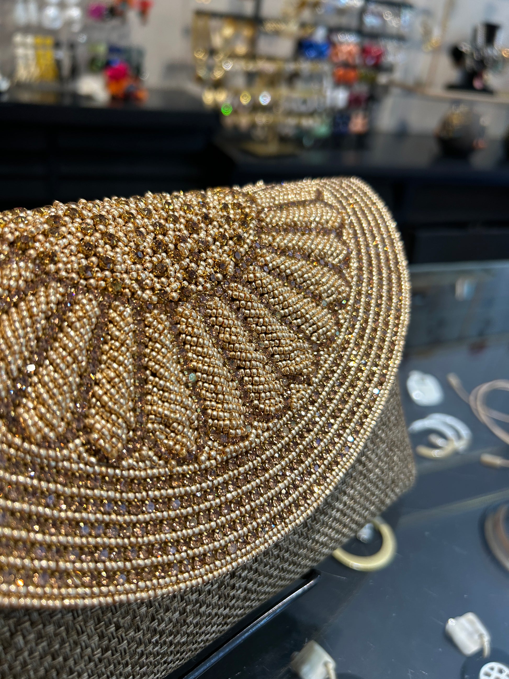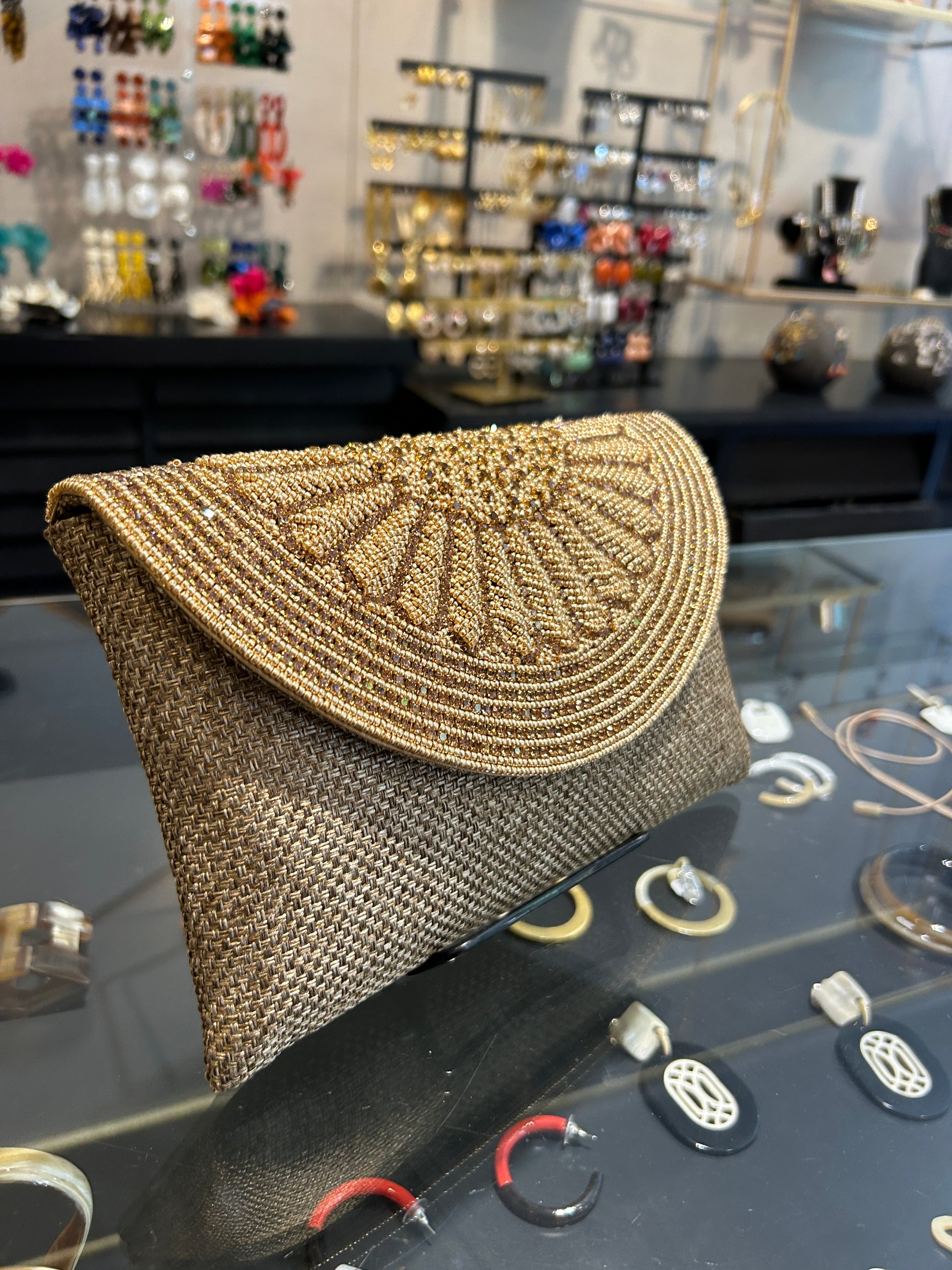 Sobre hecho artesanalmente en la India, en tejido beige natural bordado con cristales en dorado