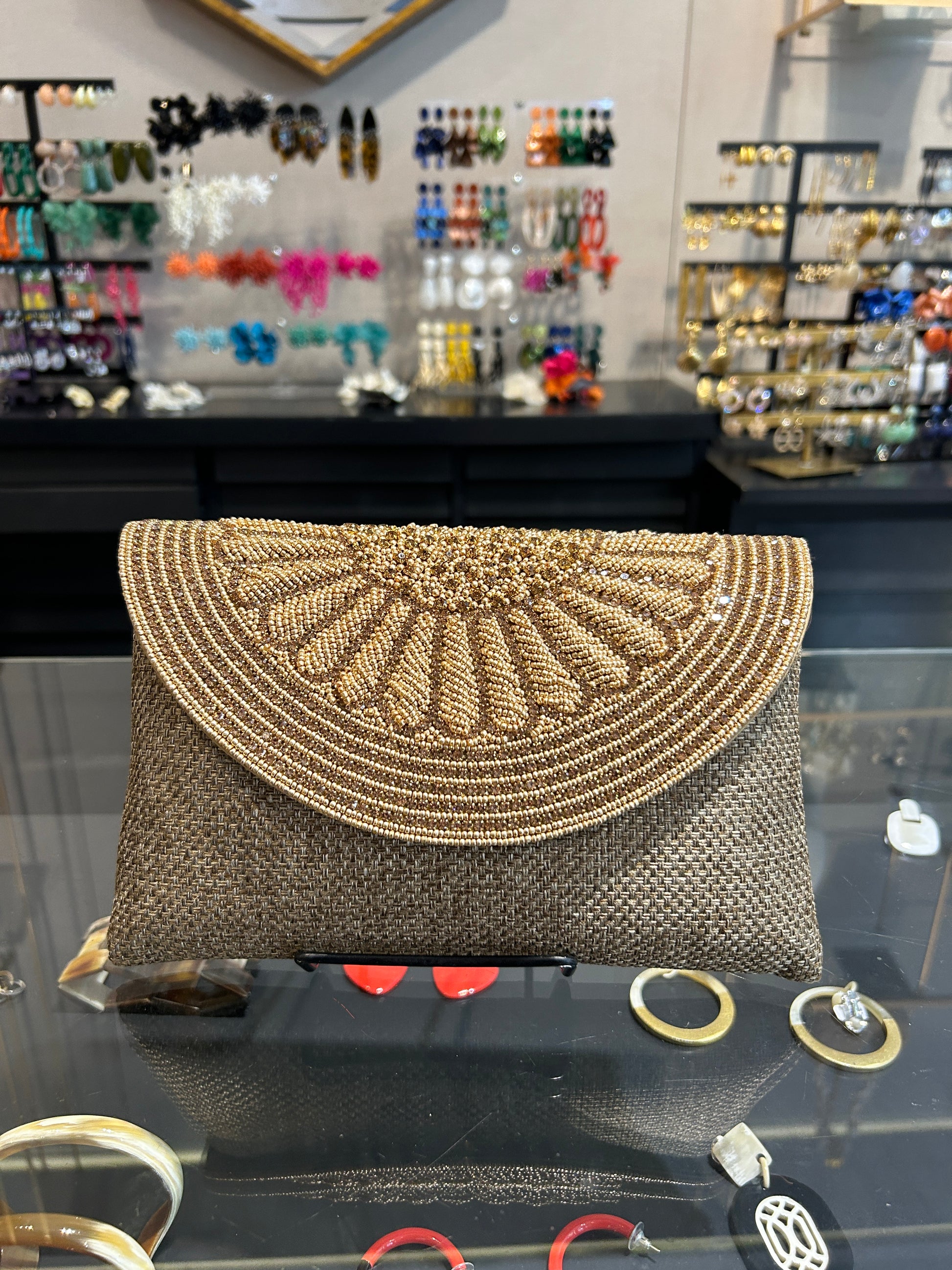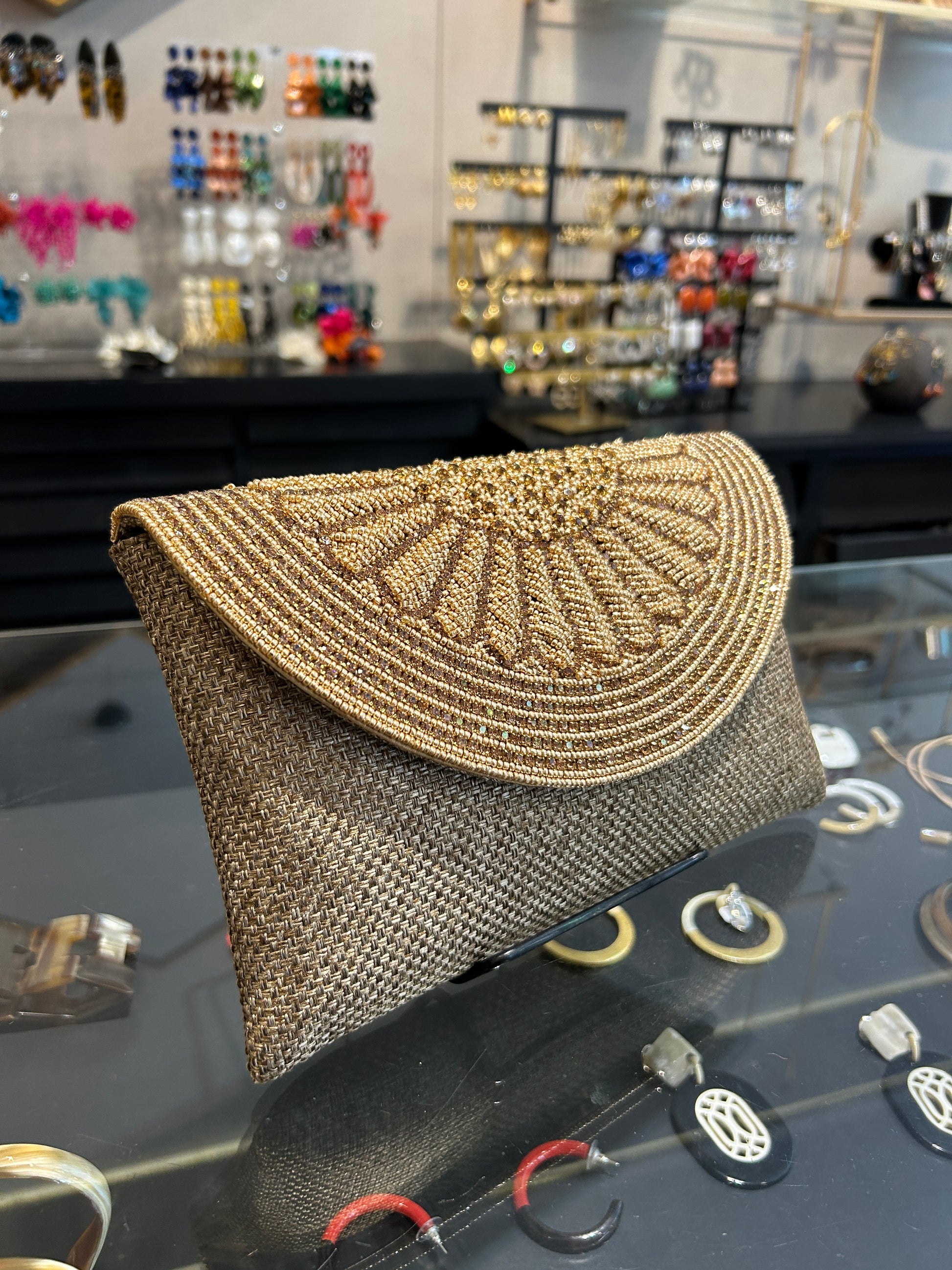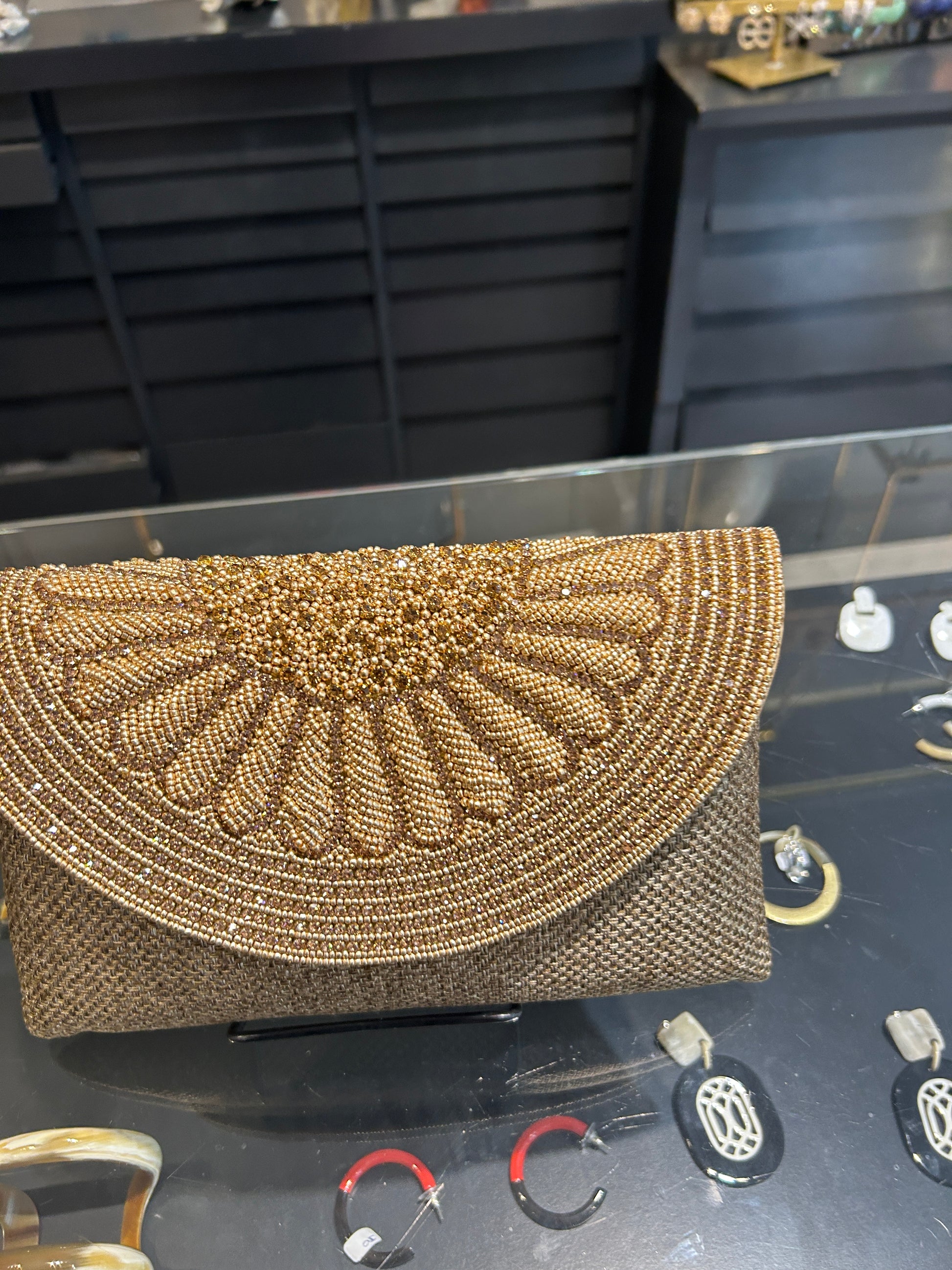 Sobre hecho artesanalmente en la India, en tejido beige natural bordado con cristales en dorado