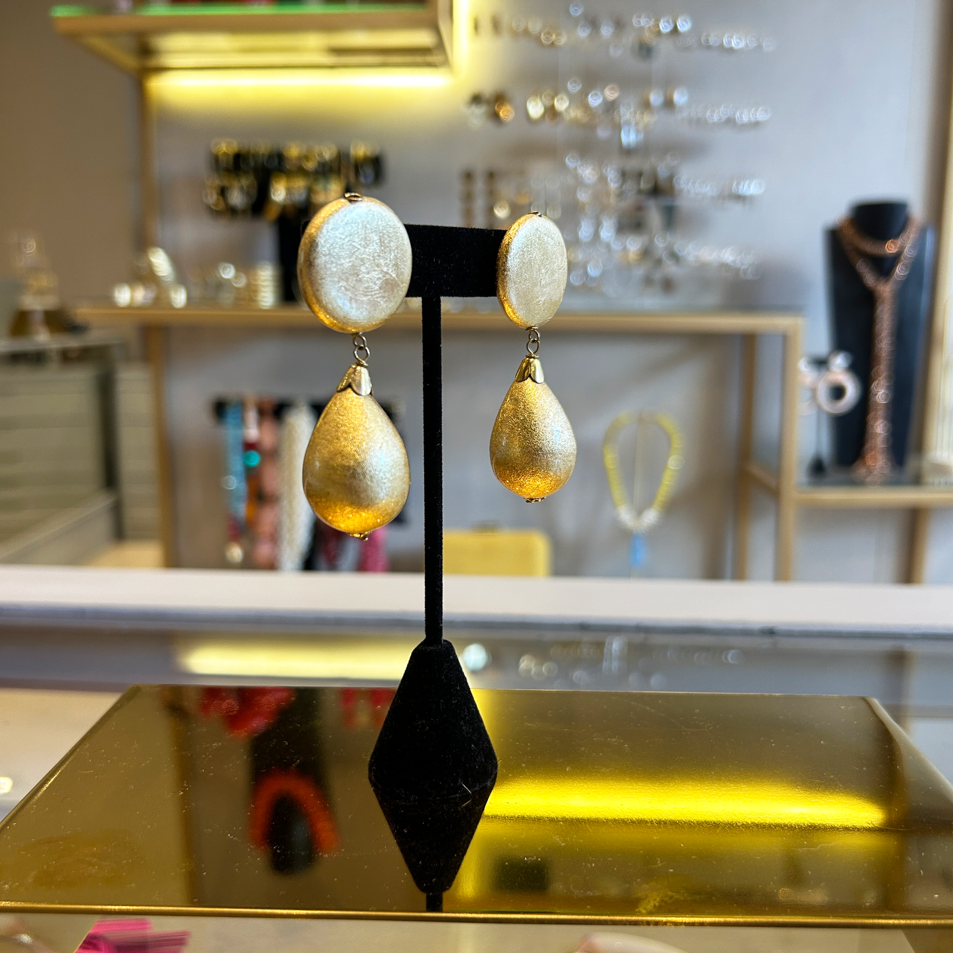 Aros de diseño exclusivo de Fahoma, hechos artesanalmente en piezas de papel dorado recubiertas en resina transparente.