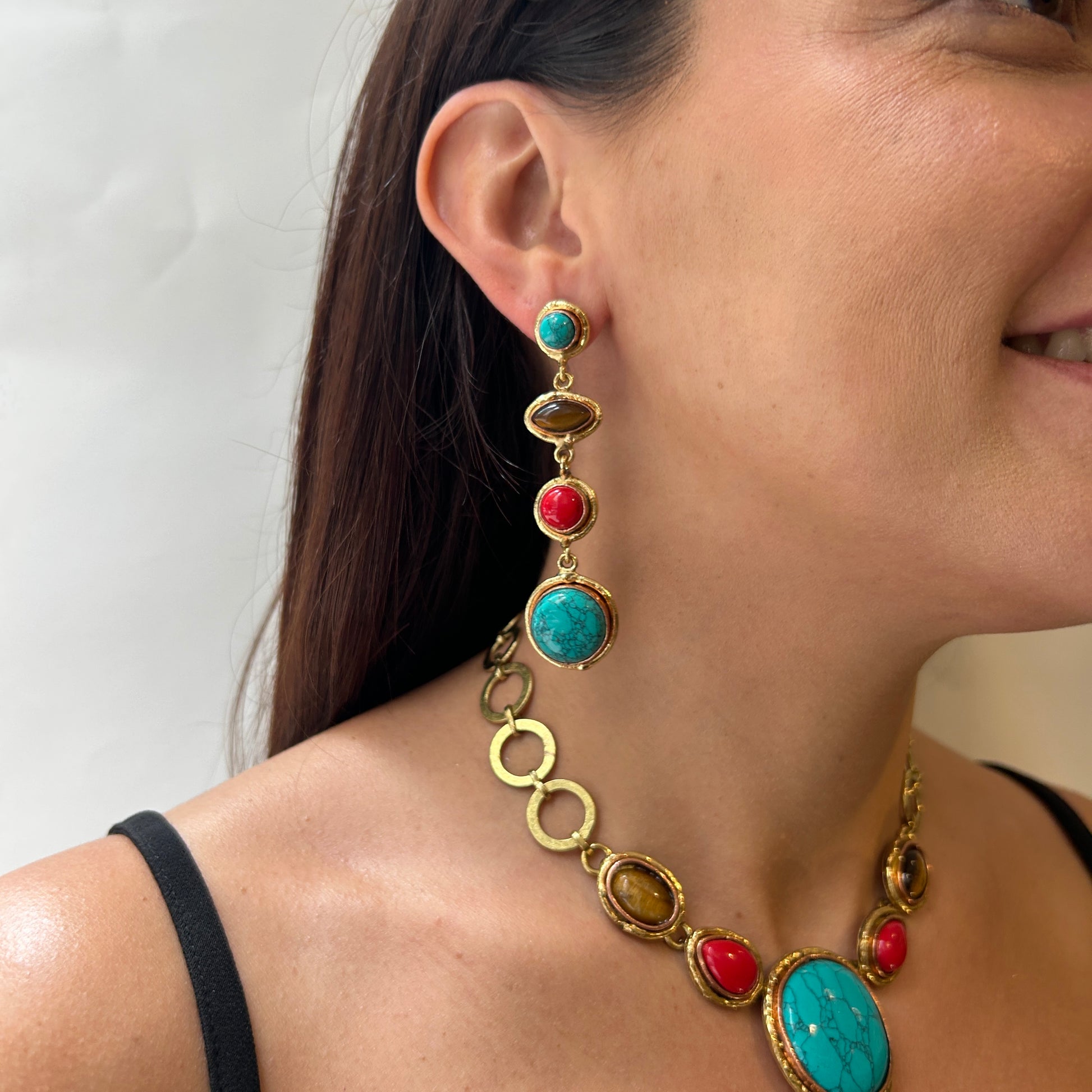Aros largos hechos artesanalmente en bronce con piedras naturales engarzadas.