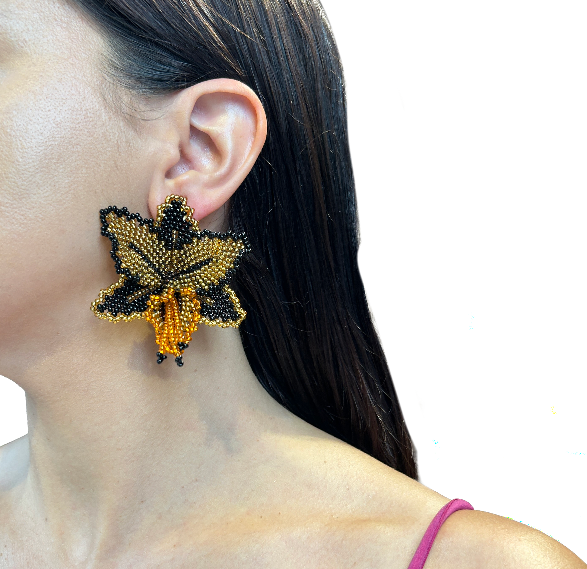 Aros hechos artesanalmente en mostacillas formando una orquídea. Gracias a su material son super livianos.