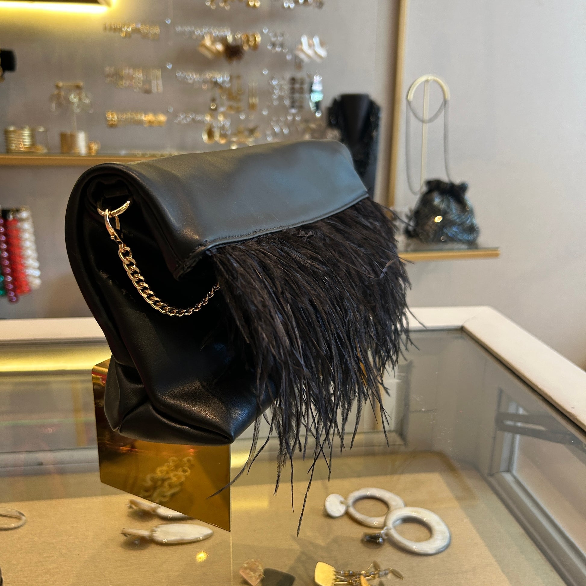 Bolso cartera hecho en eco cuero negro y plumas negras.