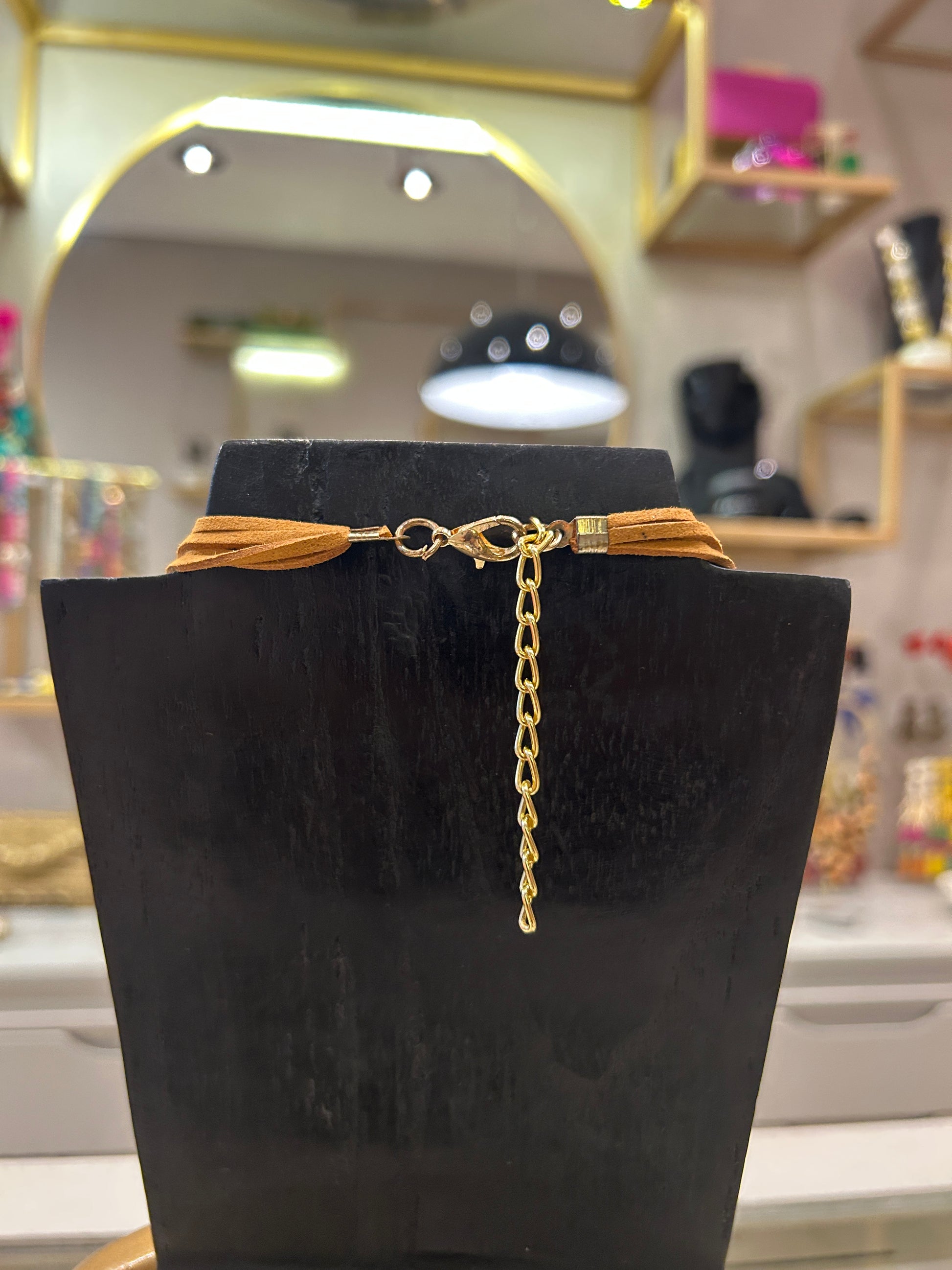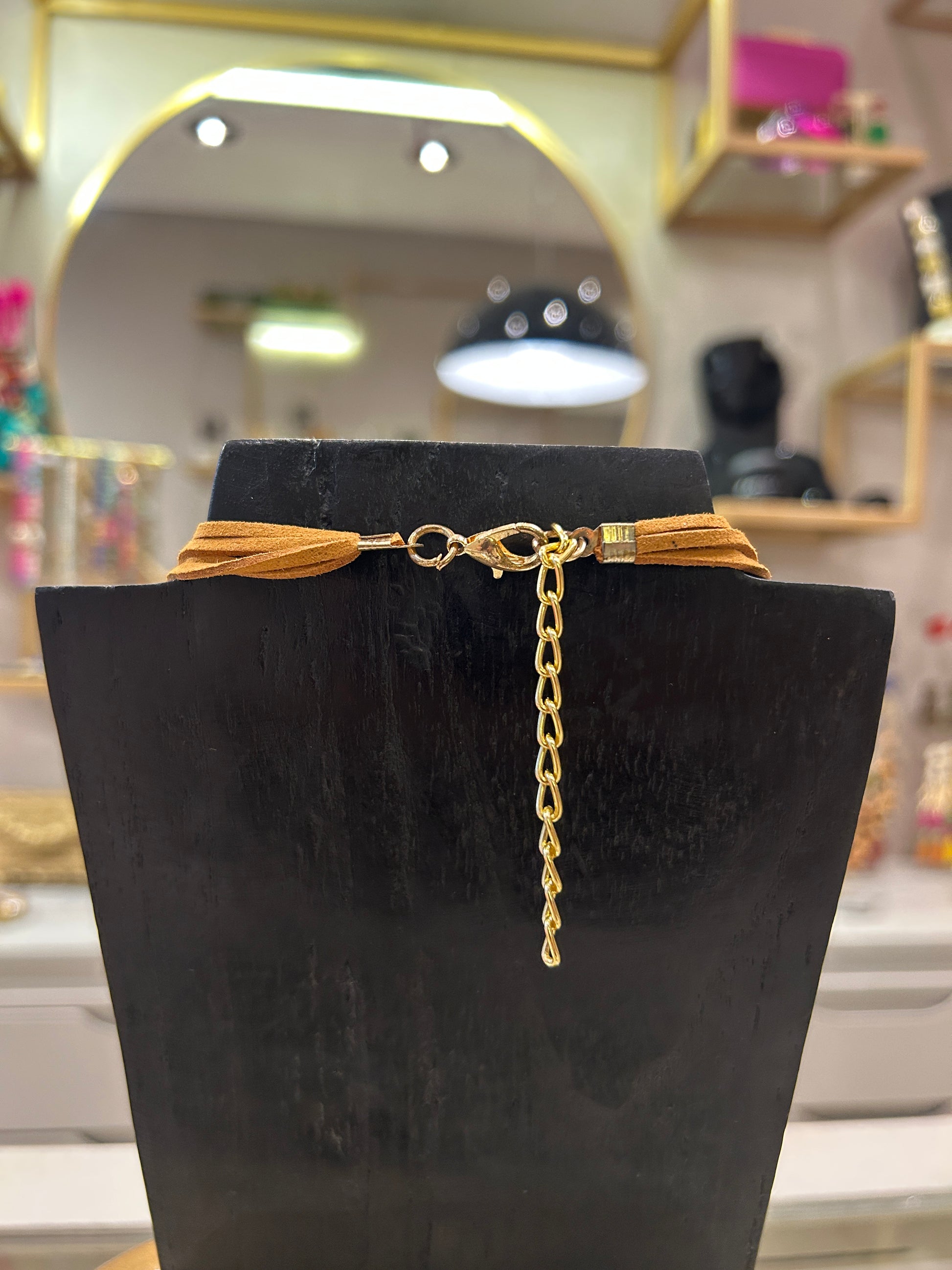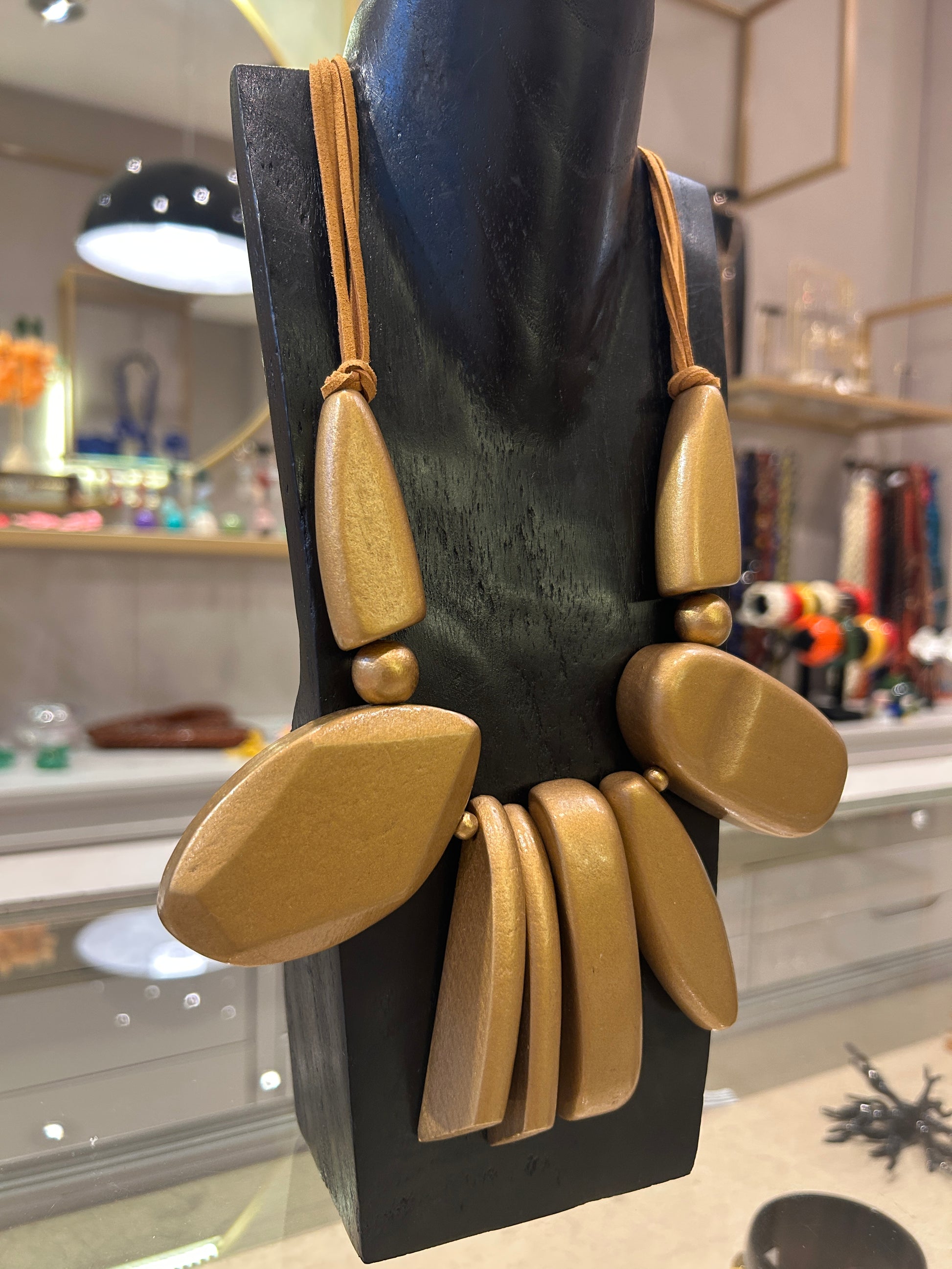 Collar corto estilo moderno hecho en diferentes cuentas de madera, finalizado en cordon de gamuza.
