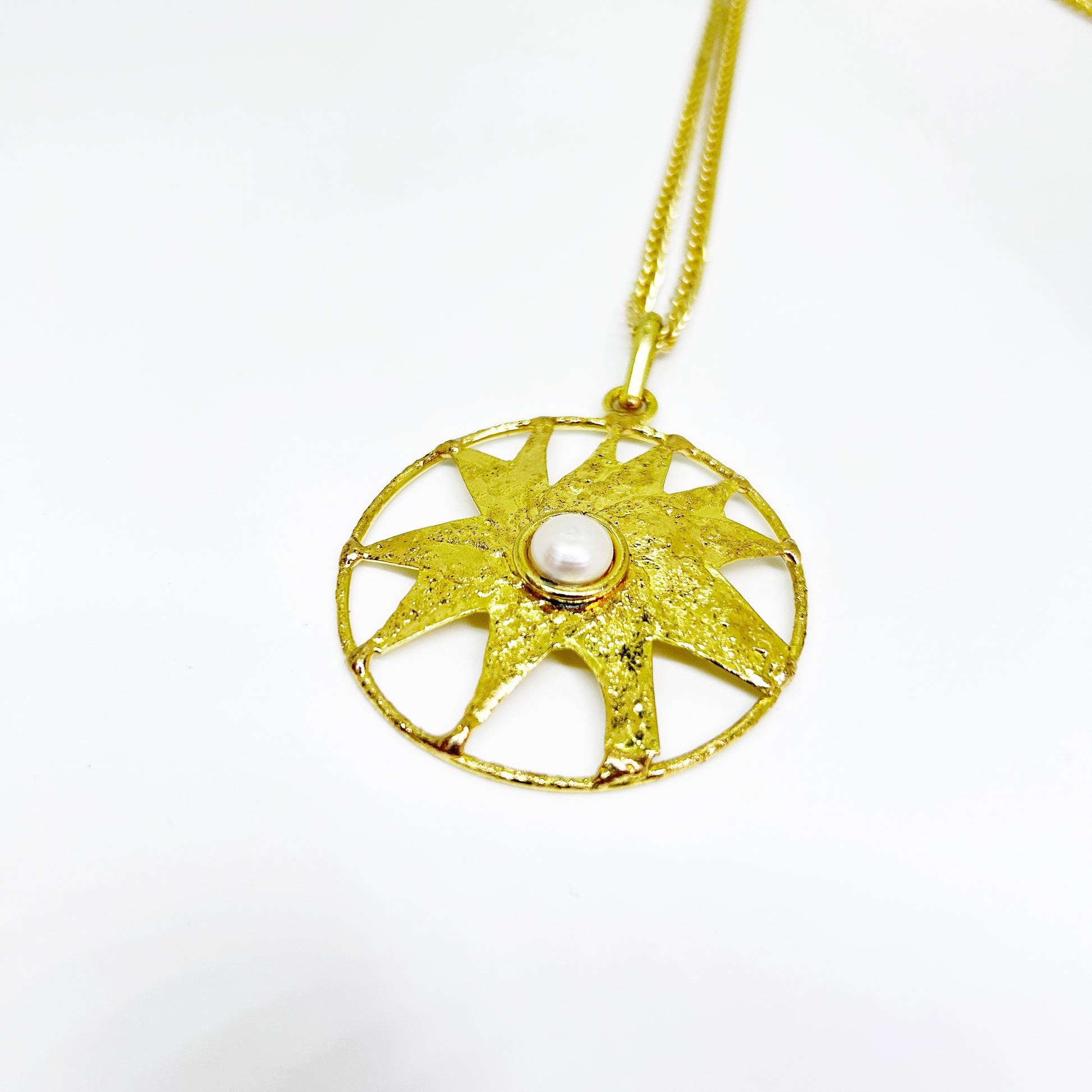 Collar hecho artesanalmente en bronce con dije en forma de sol con perla tipo barroca en el centro. Una pieza super moderna y atemporal para usar solo o cambiando con collares de piedras o cadenas!