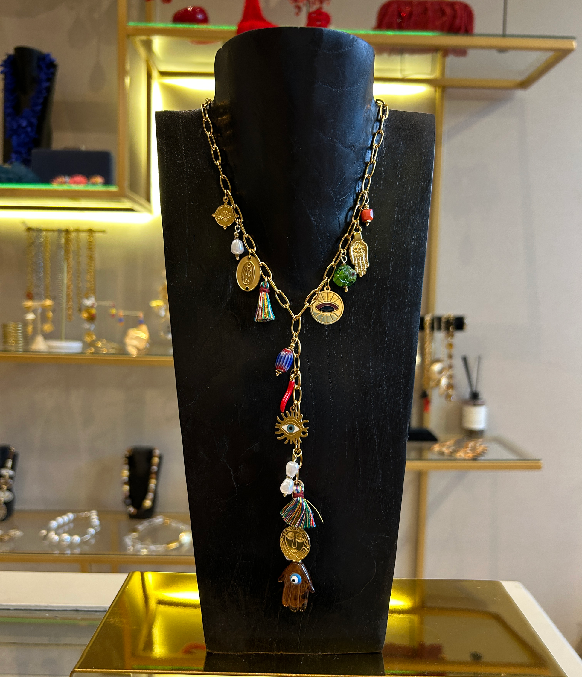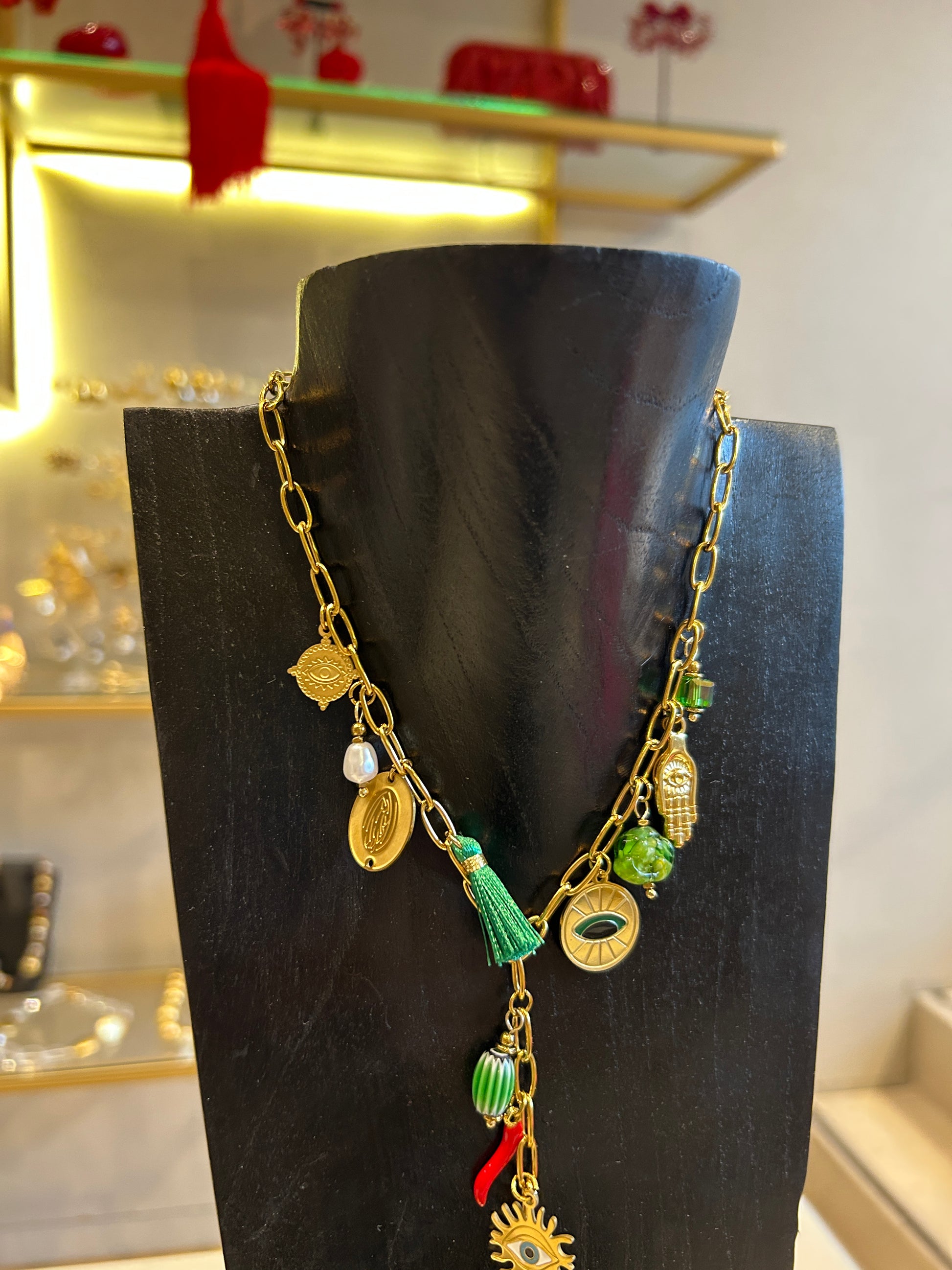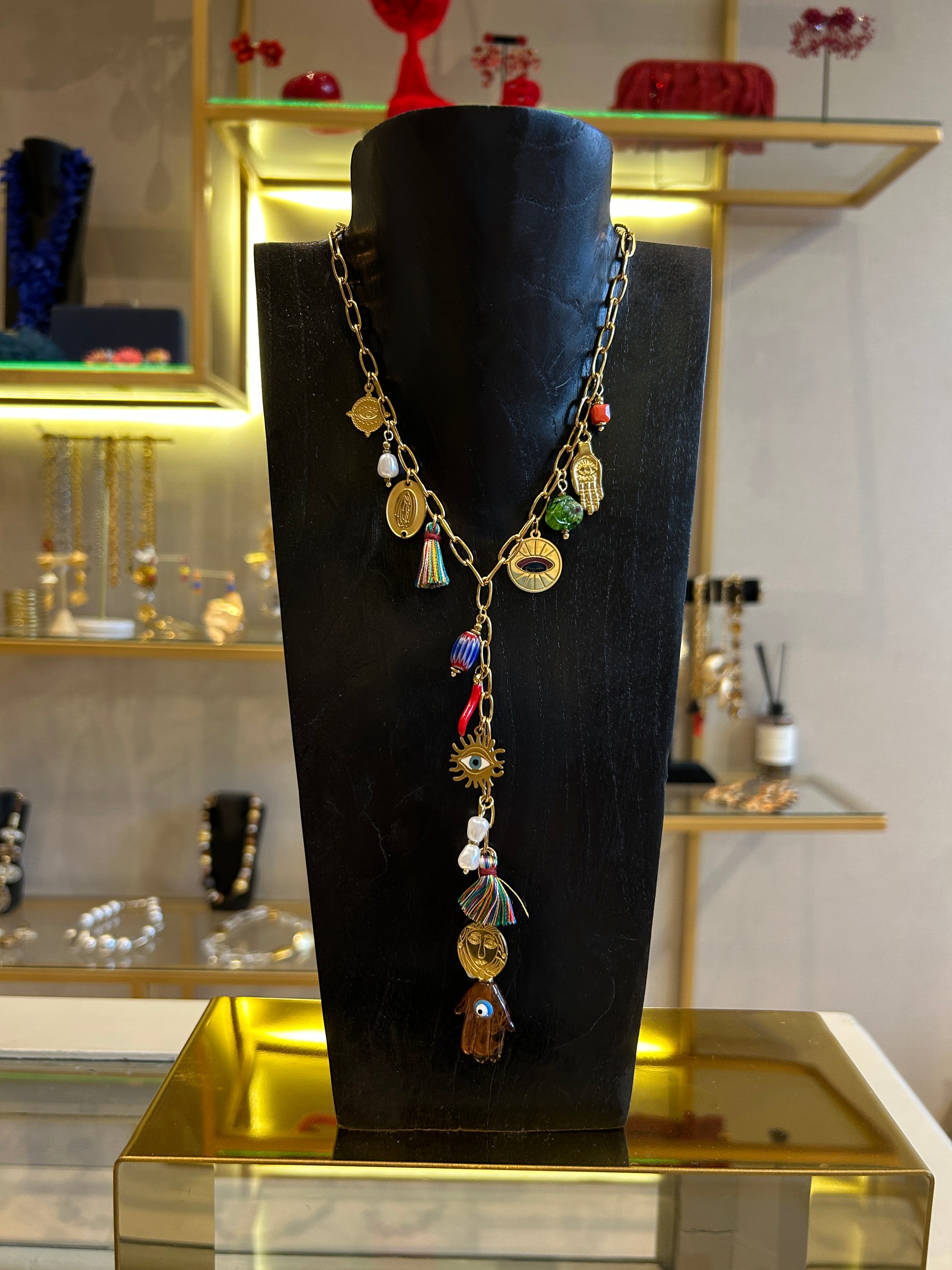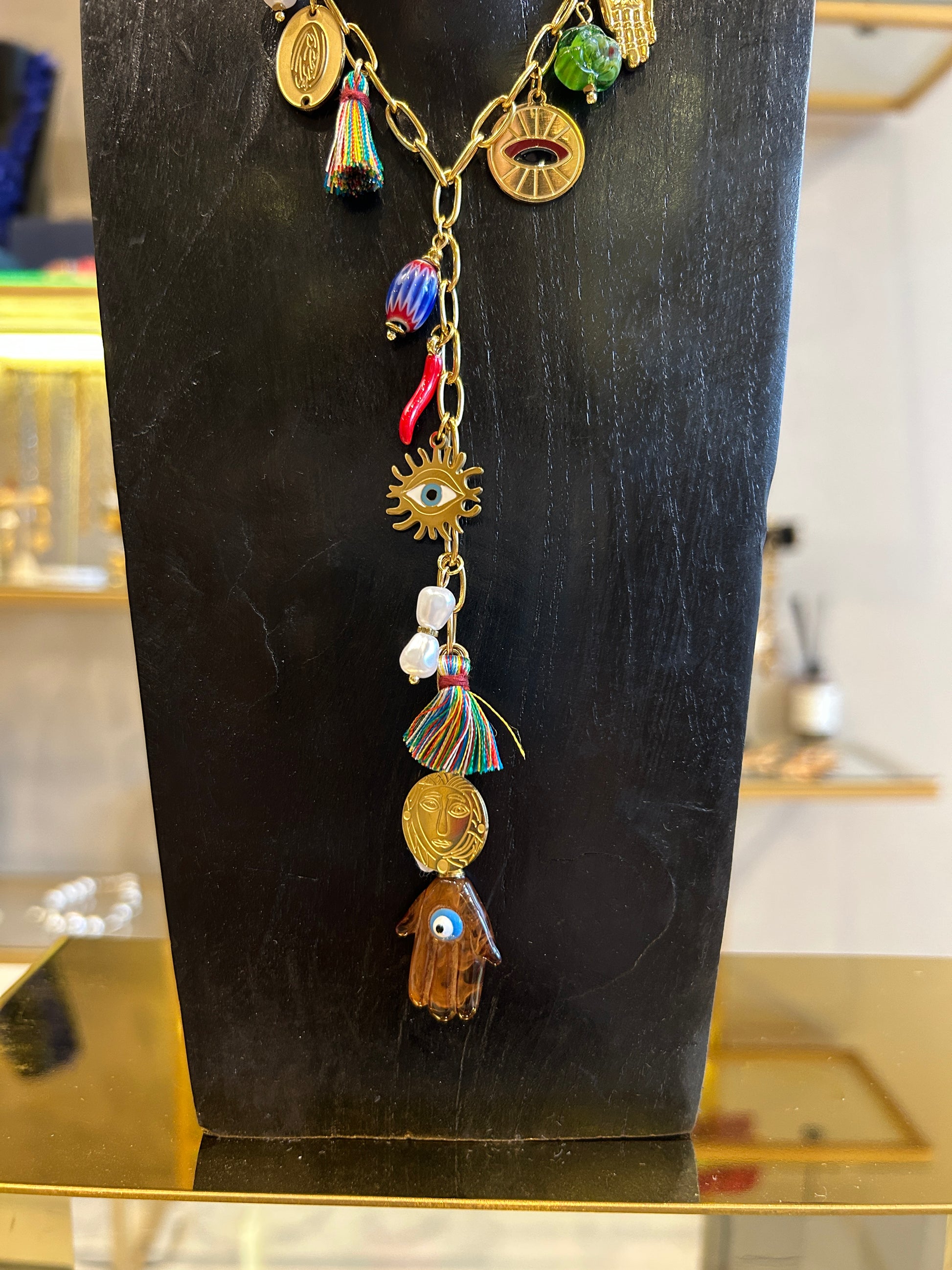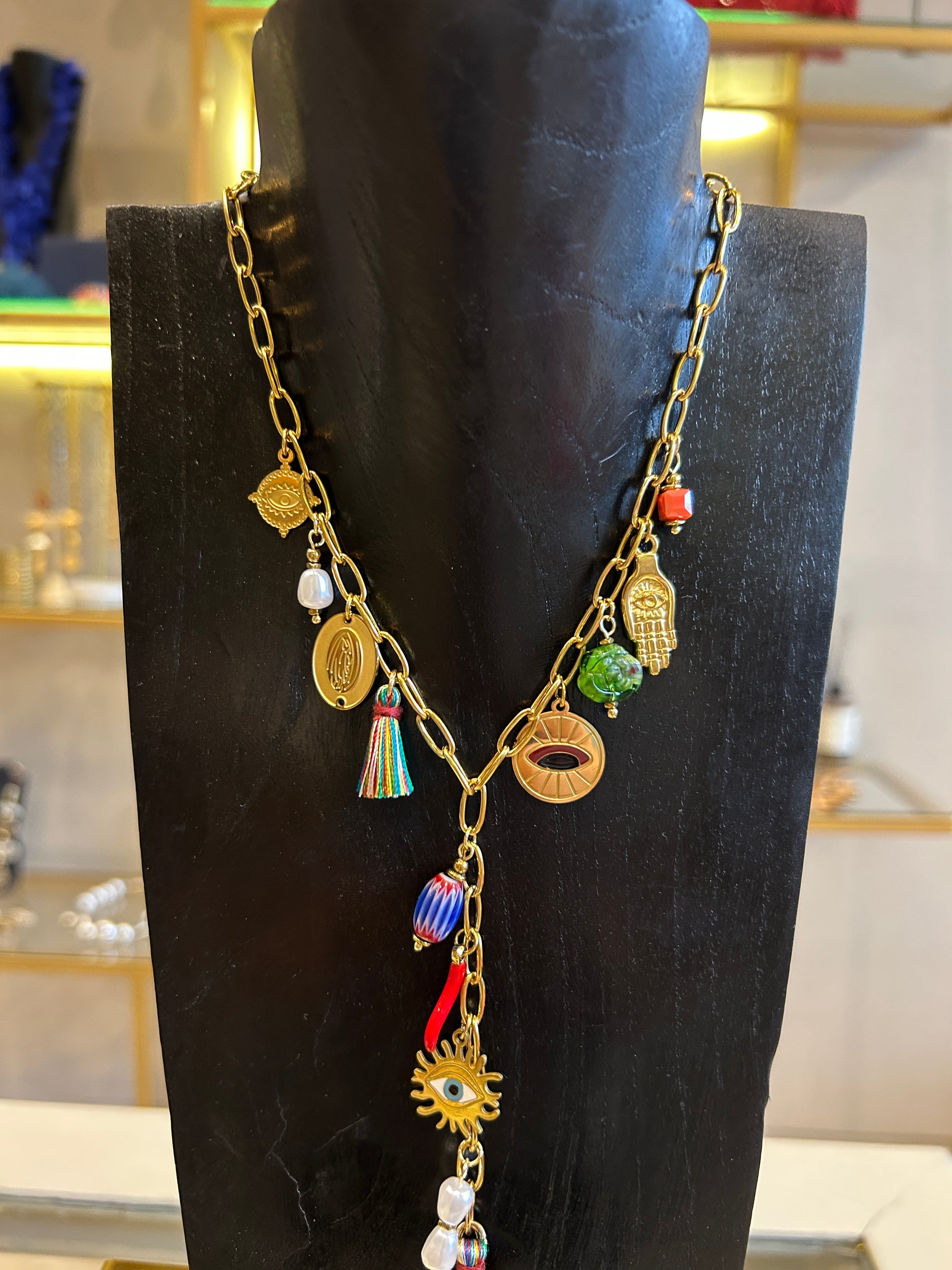 Collar tipo corbatero de cadena con dijes de protección.