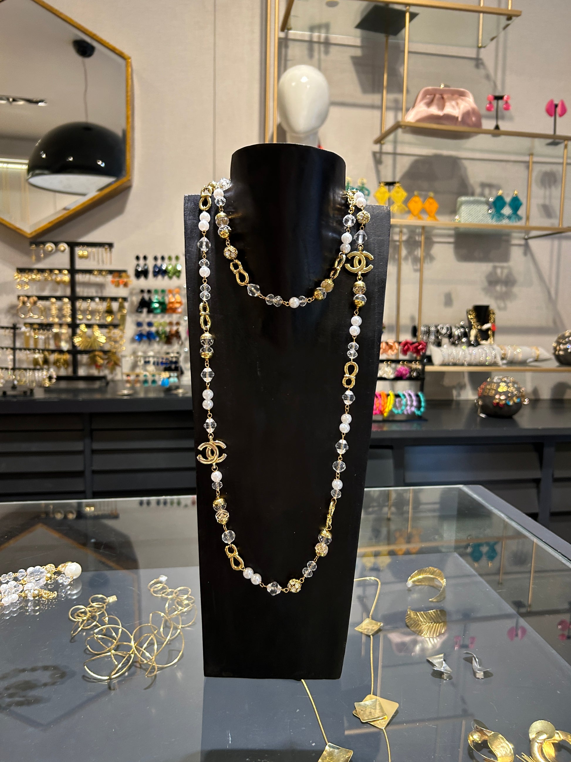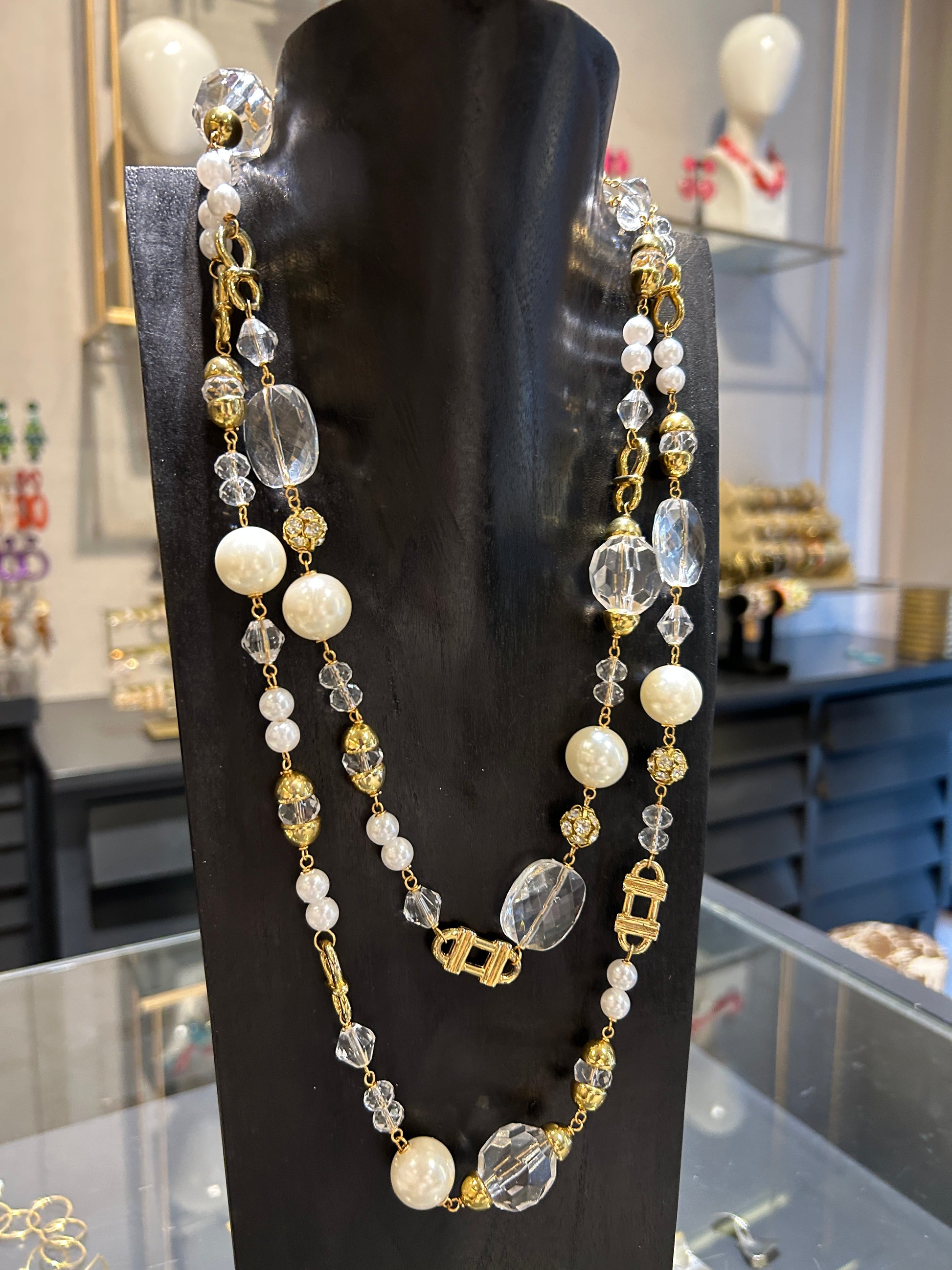 Collar largo hecho en resinas transparentes, cristal , perlas plásticas y piezas de trabas doradas.