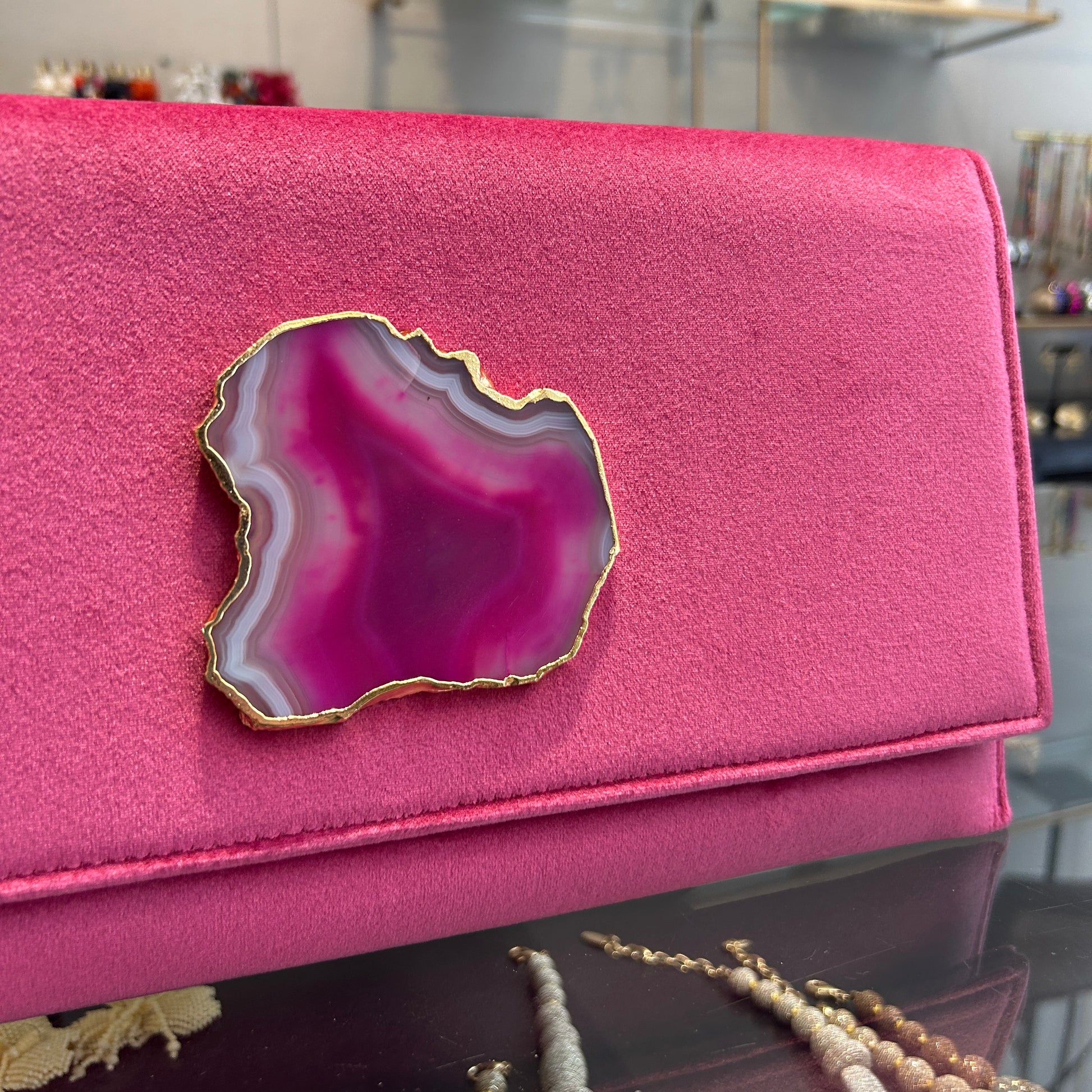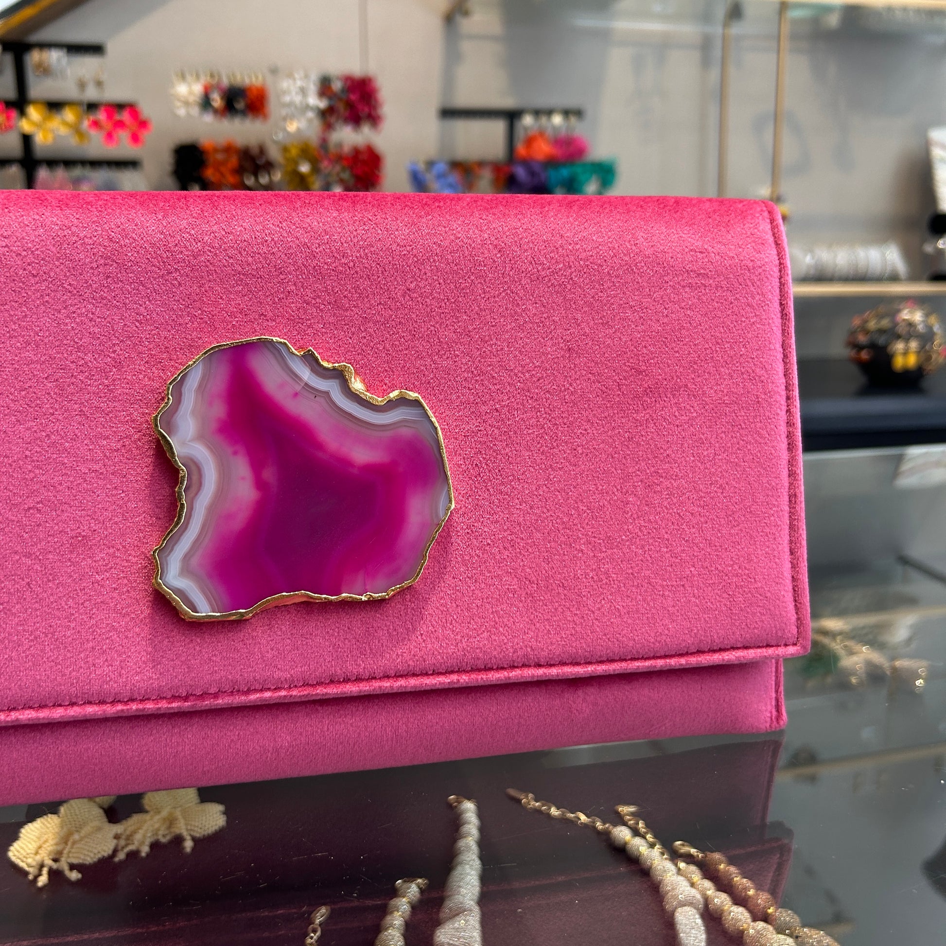 Sobre hecho artesanalmente en la India, en tela aterciopelada color rosa con aplique de piedra tipo ágata a tono