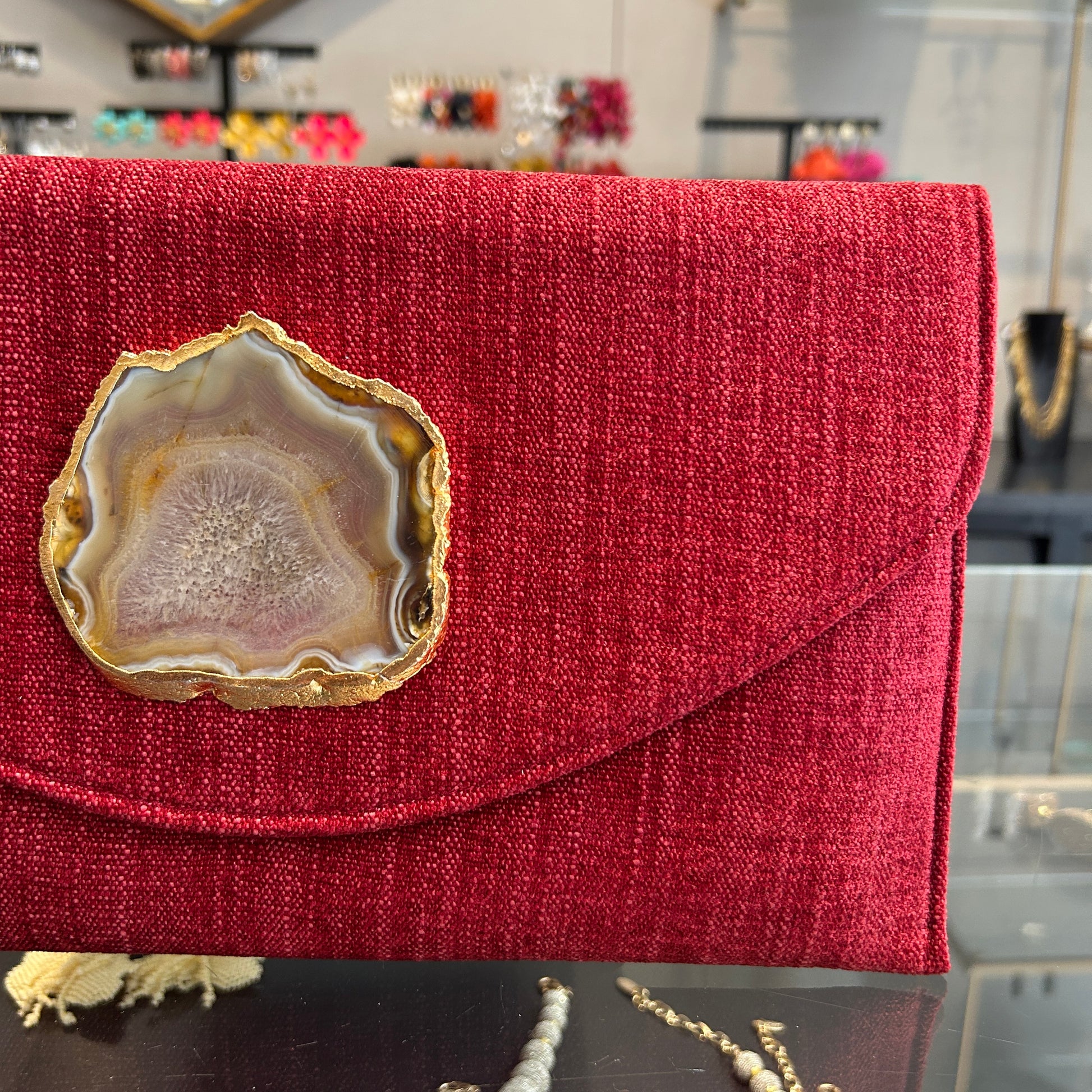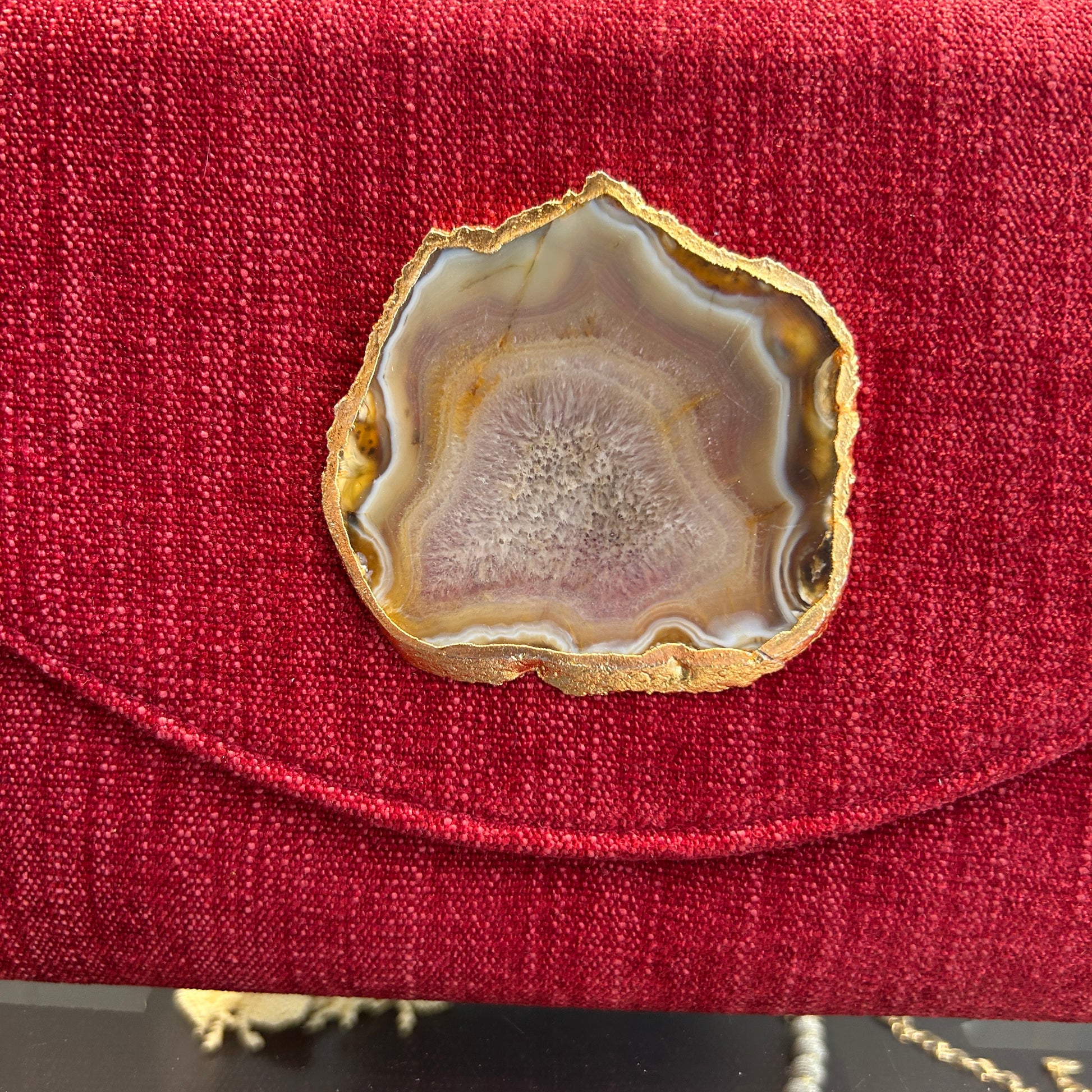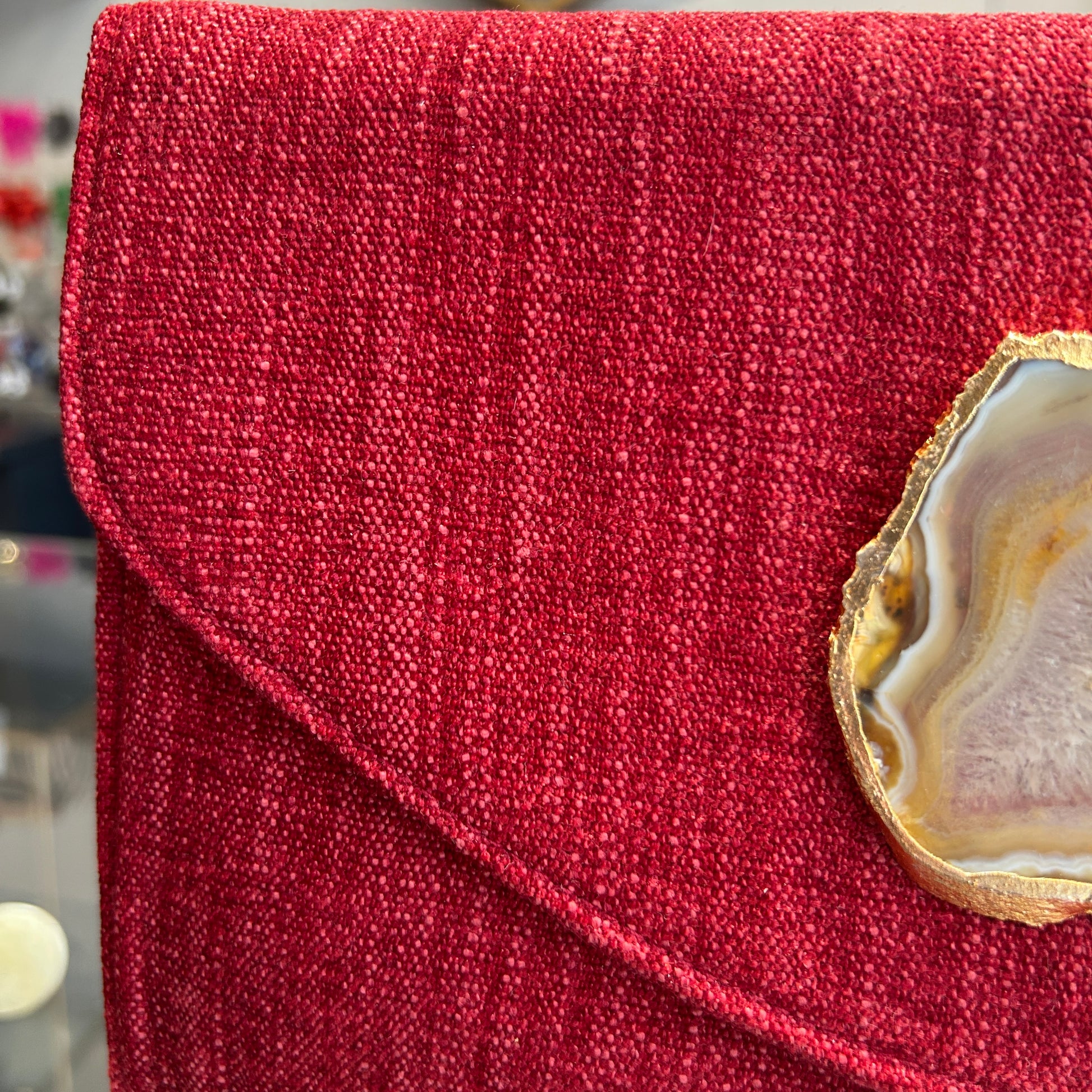 Sobre hecho artesanalmente en la India, en tela aterciopelada color rojo con aplique de piedra tipo ágata beige