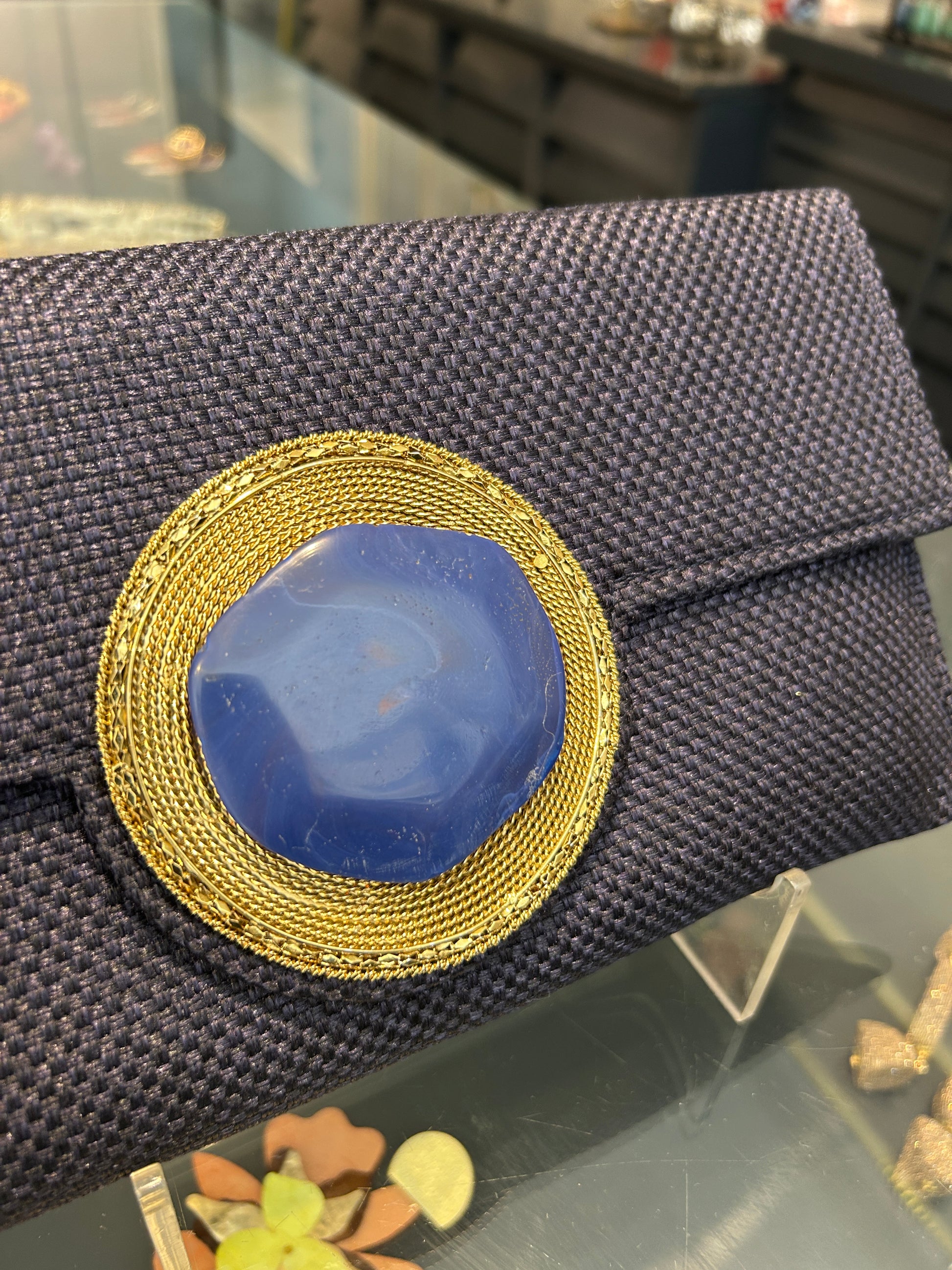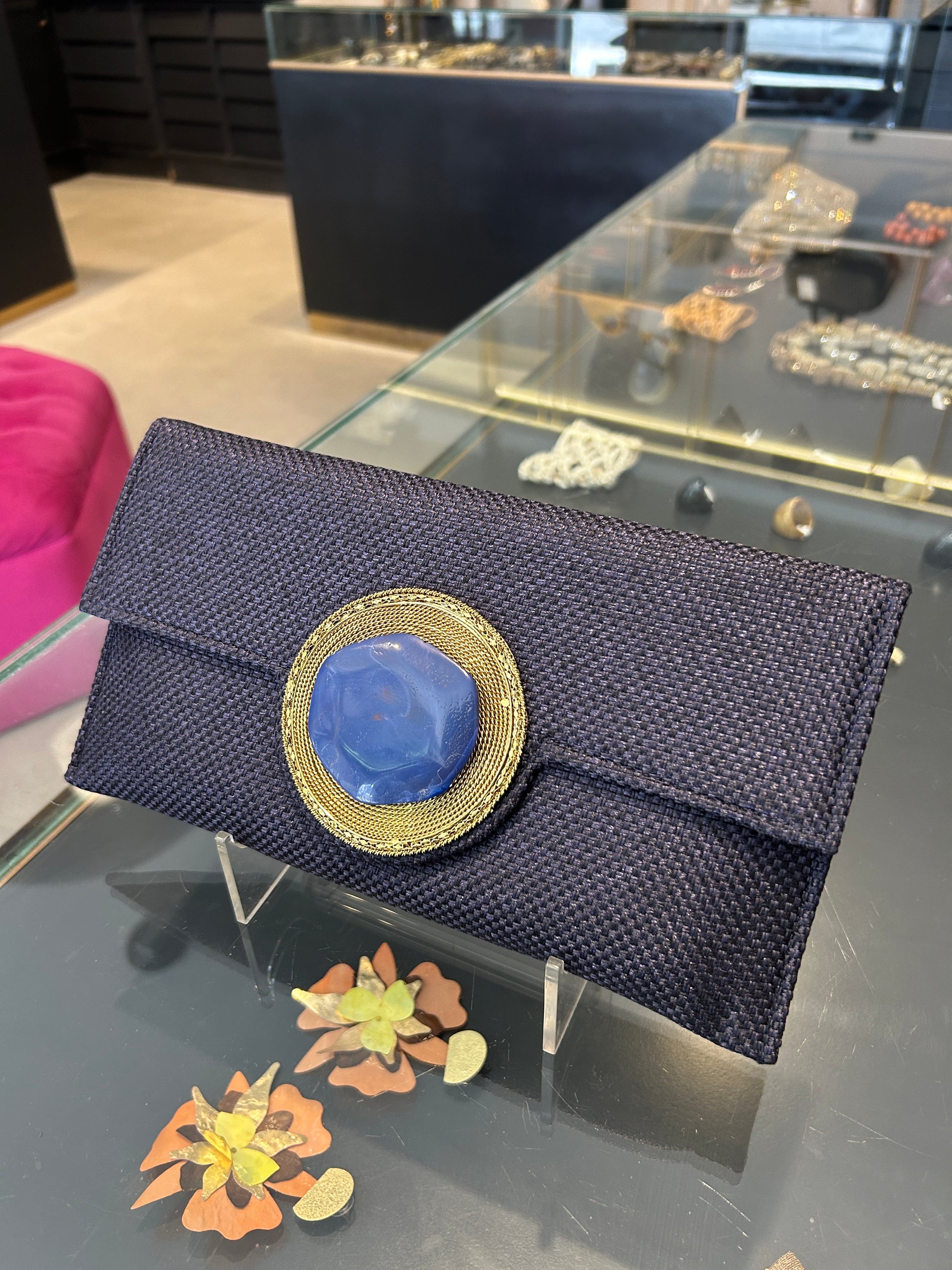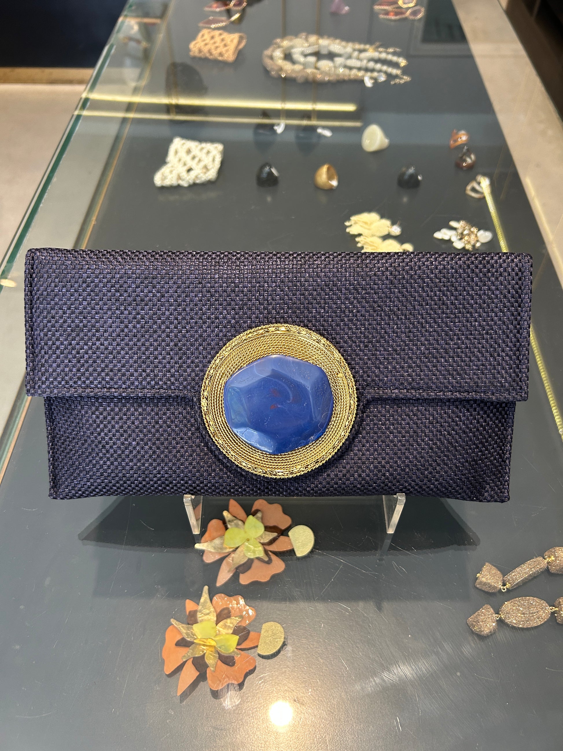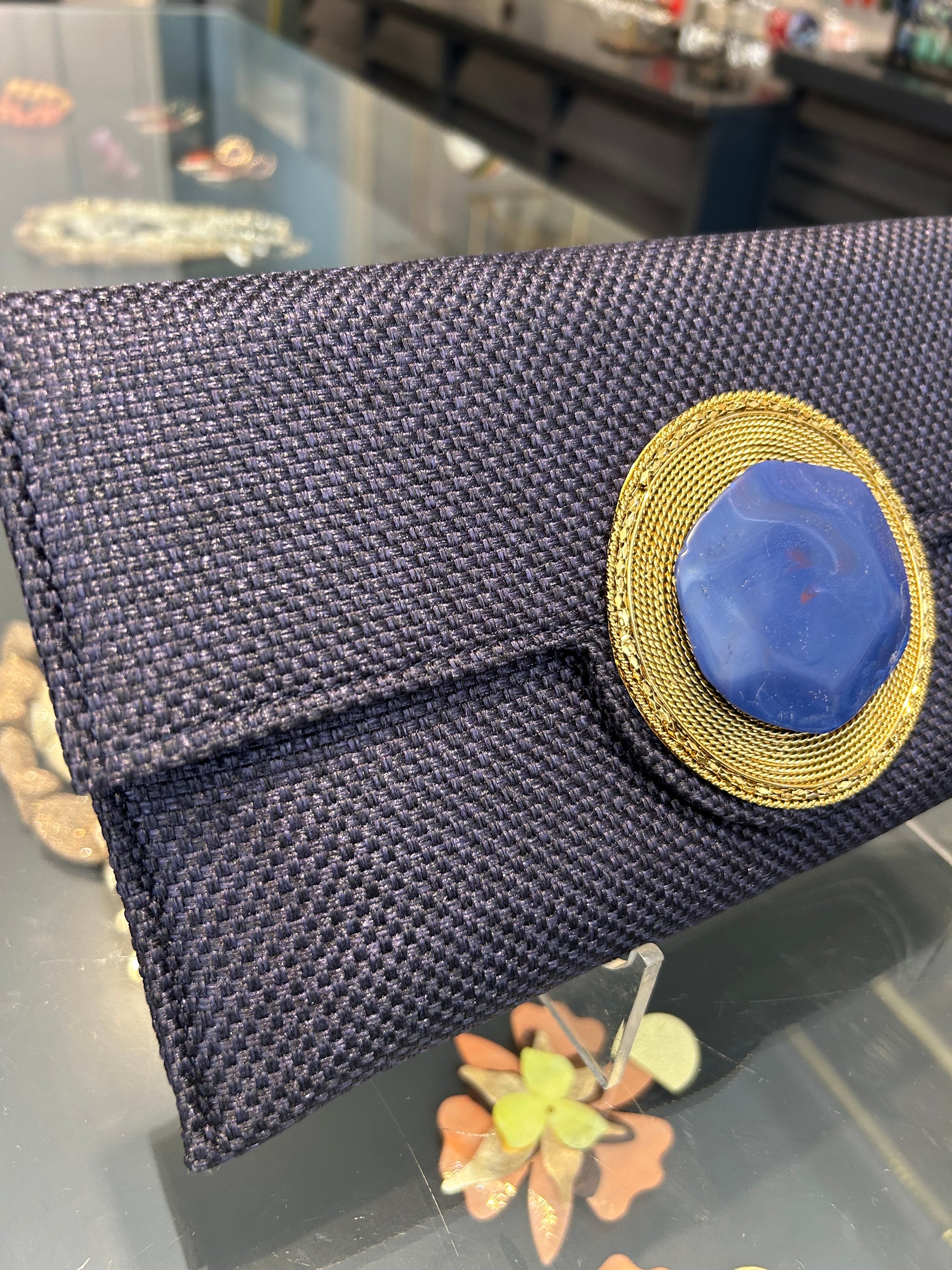 Sobre hecho artesanalmente en la India, en tejido color azul marino con con aplique de piedra ágata a tono y metal dorado.
