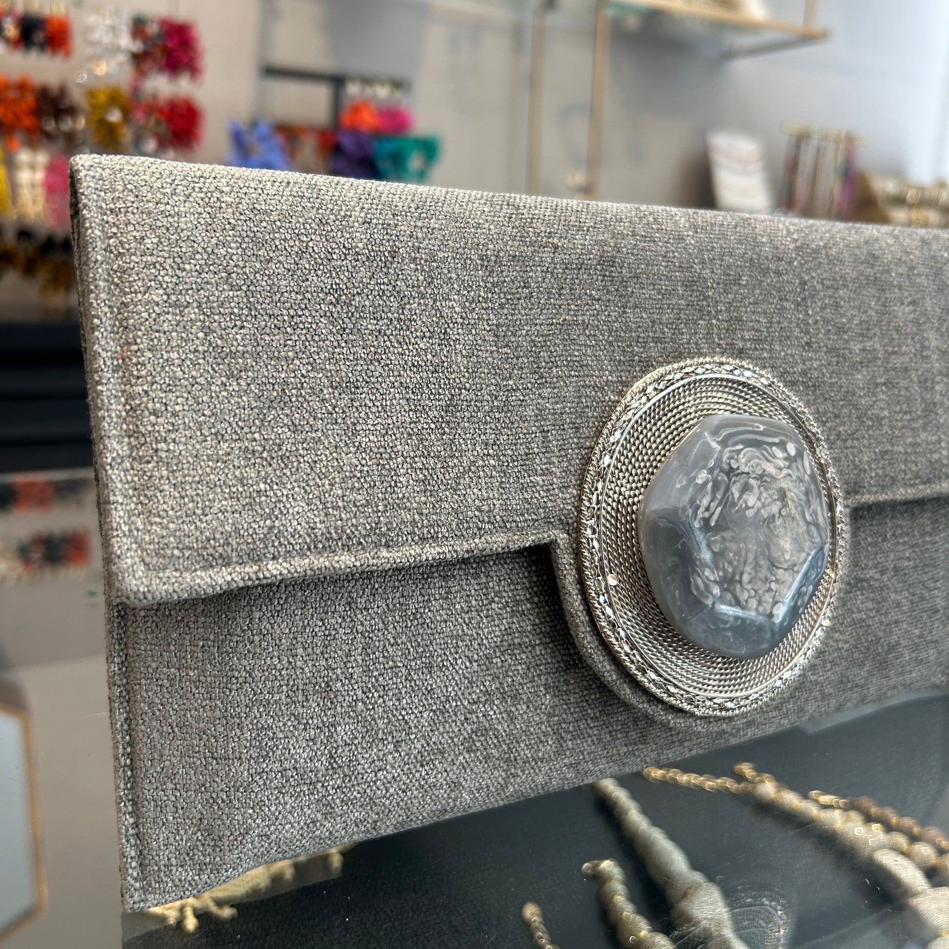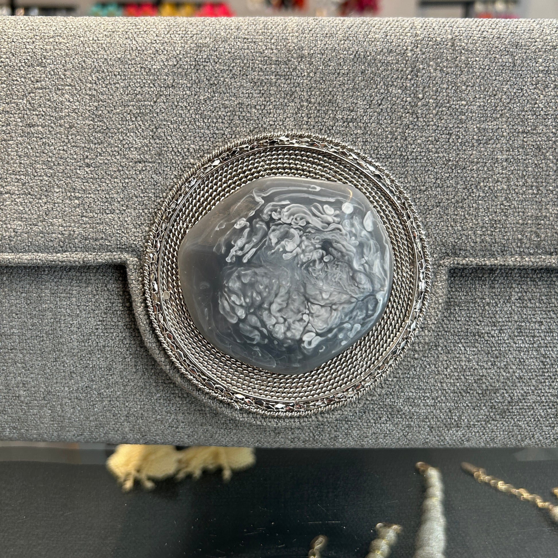 Sobre hecho artesanalmente en la India, en tejido aterciopelado en color gris con aplique de ágata a tono y detalle en metal plateado.