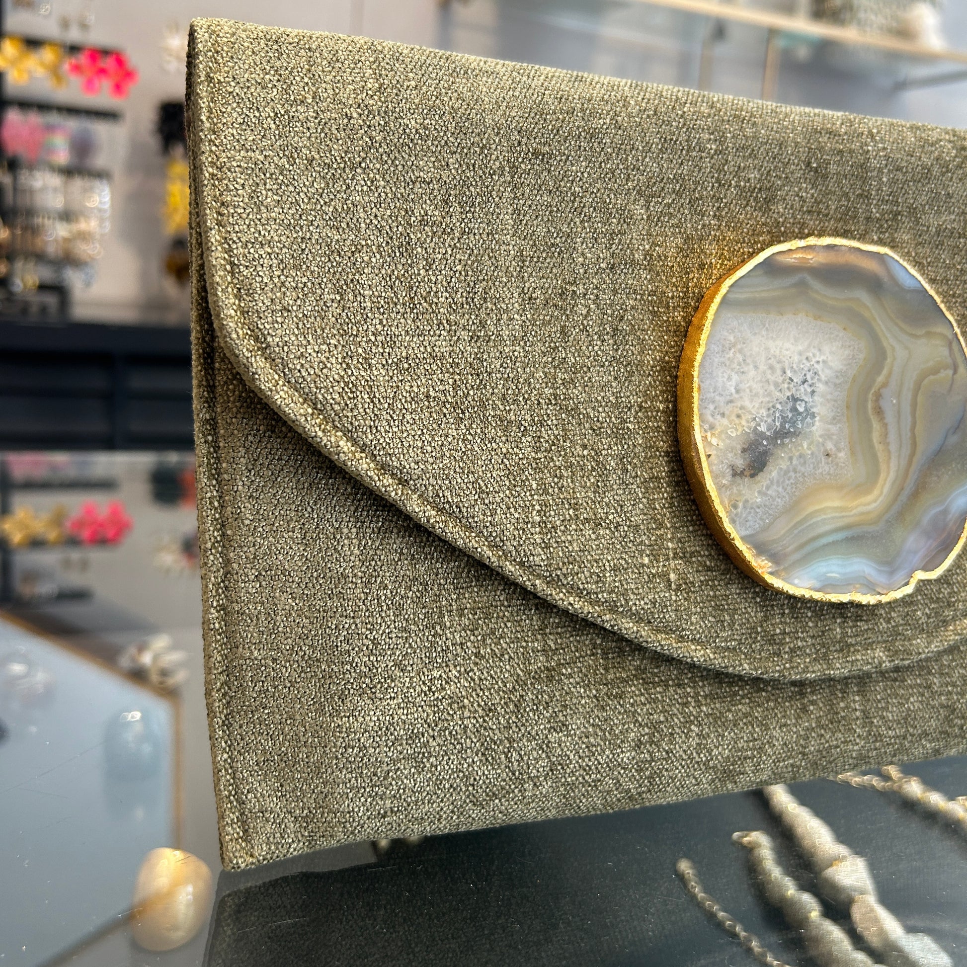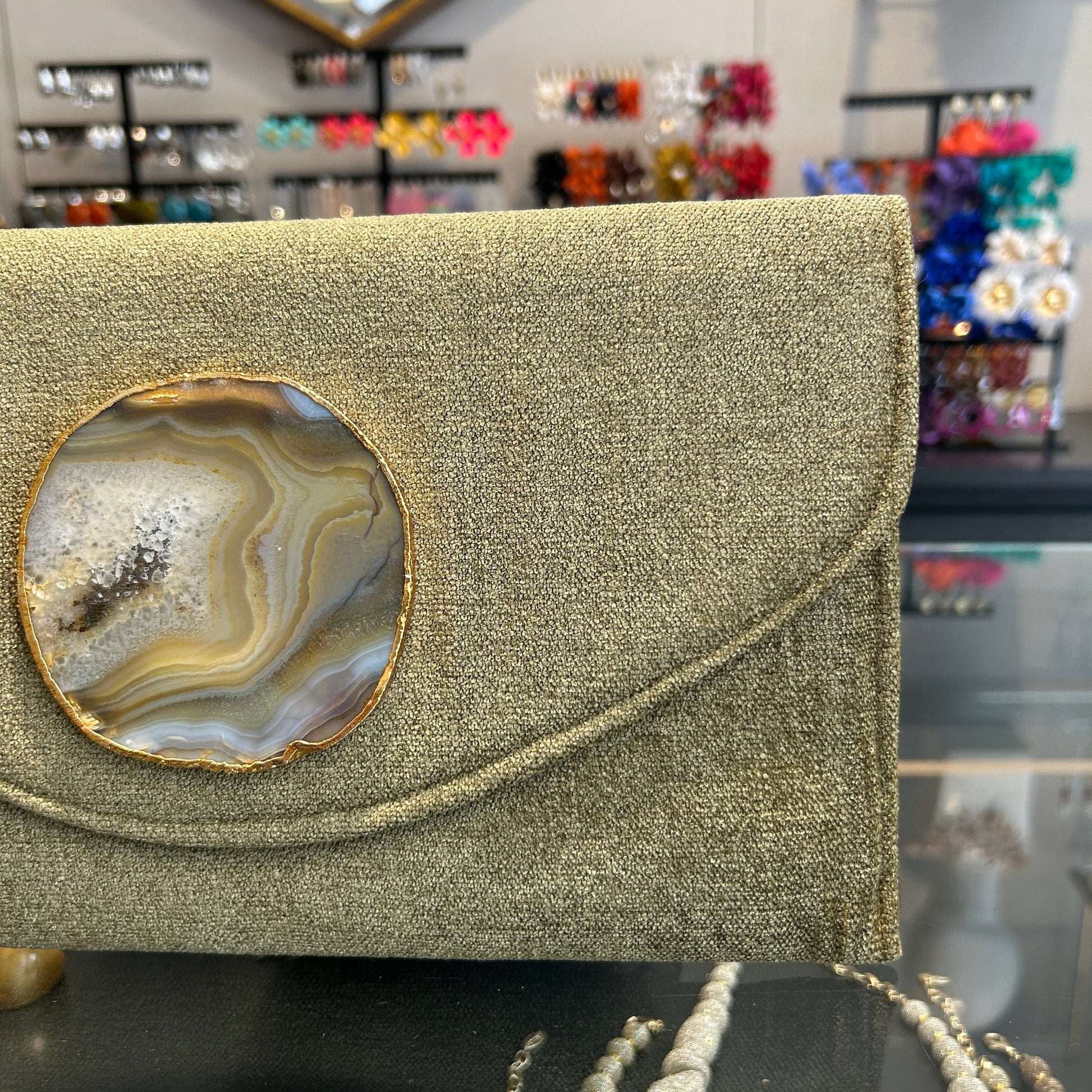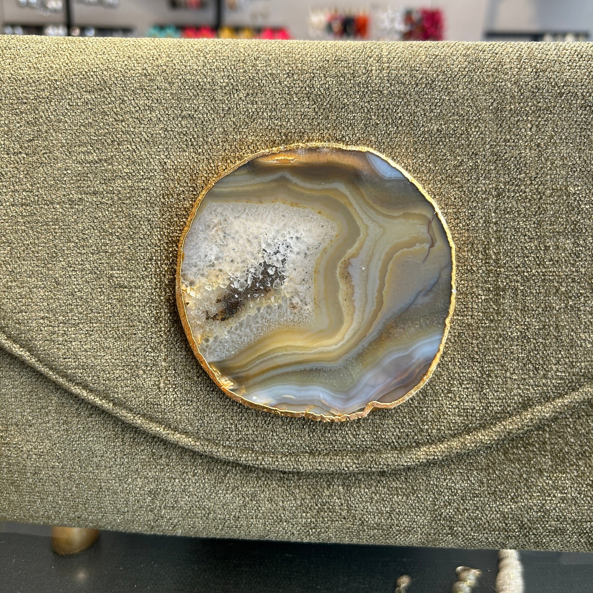Sobre hecho artesanalmente en la India, en tela aterciopelada color caqui con aplique de piedra ágata a tono.