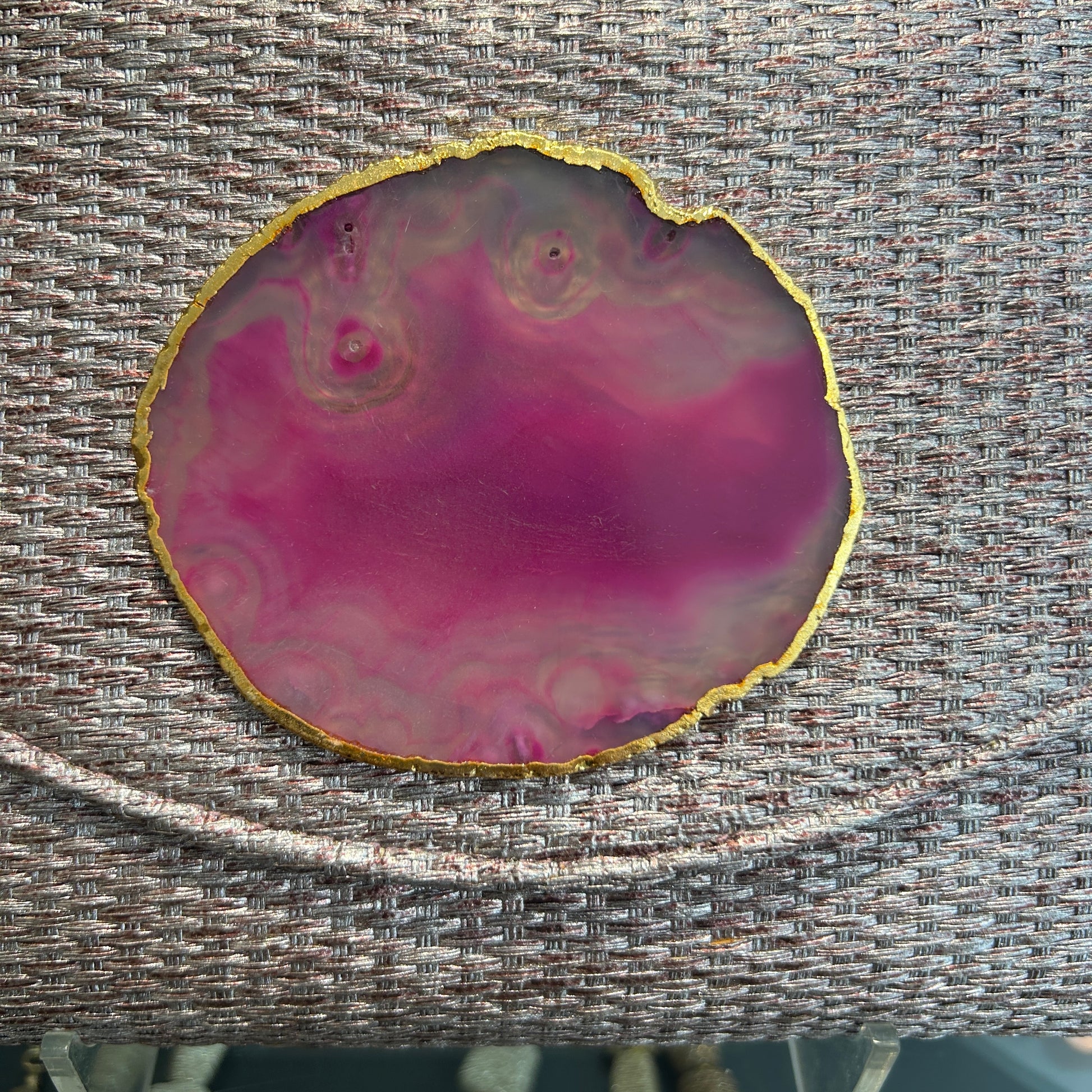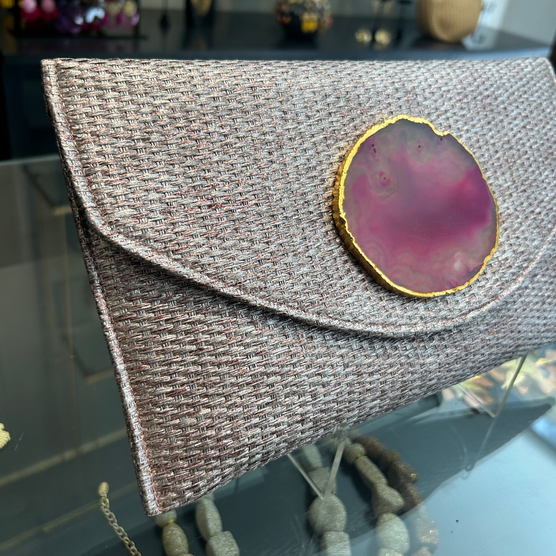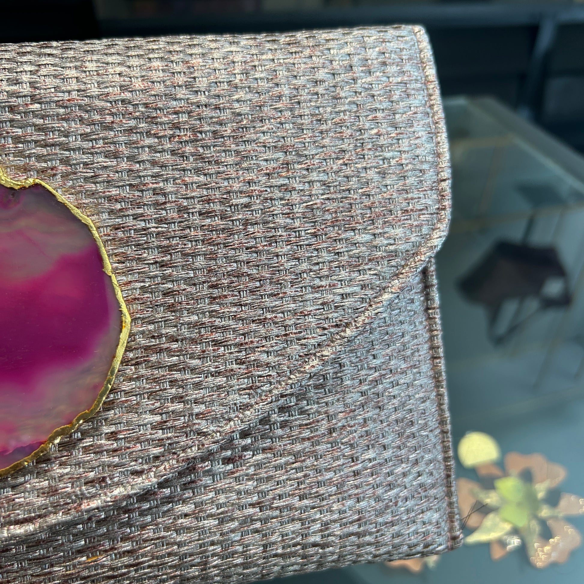 Sobre hecho artesanalmente en la India, en tejido tipo rafia rosa jaspeado con plateado con aplique de piedra ágata a tono.