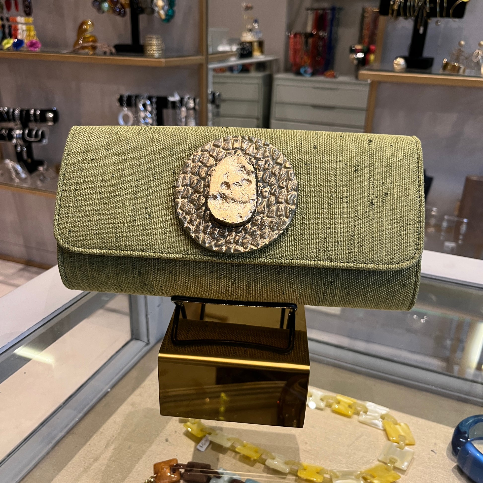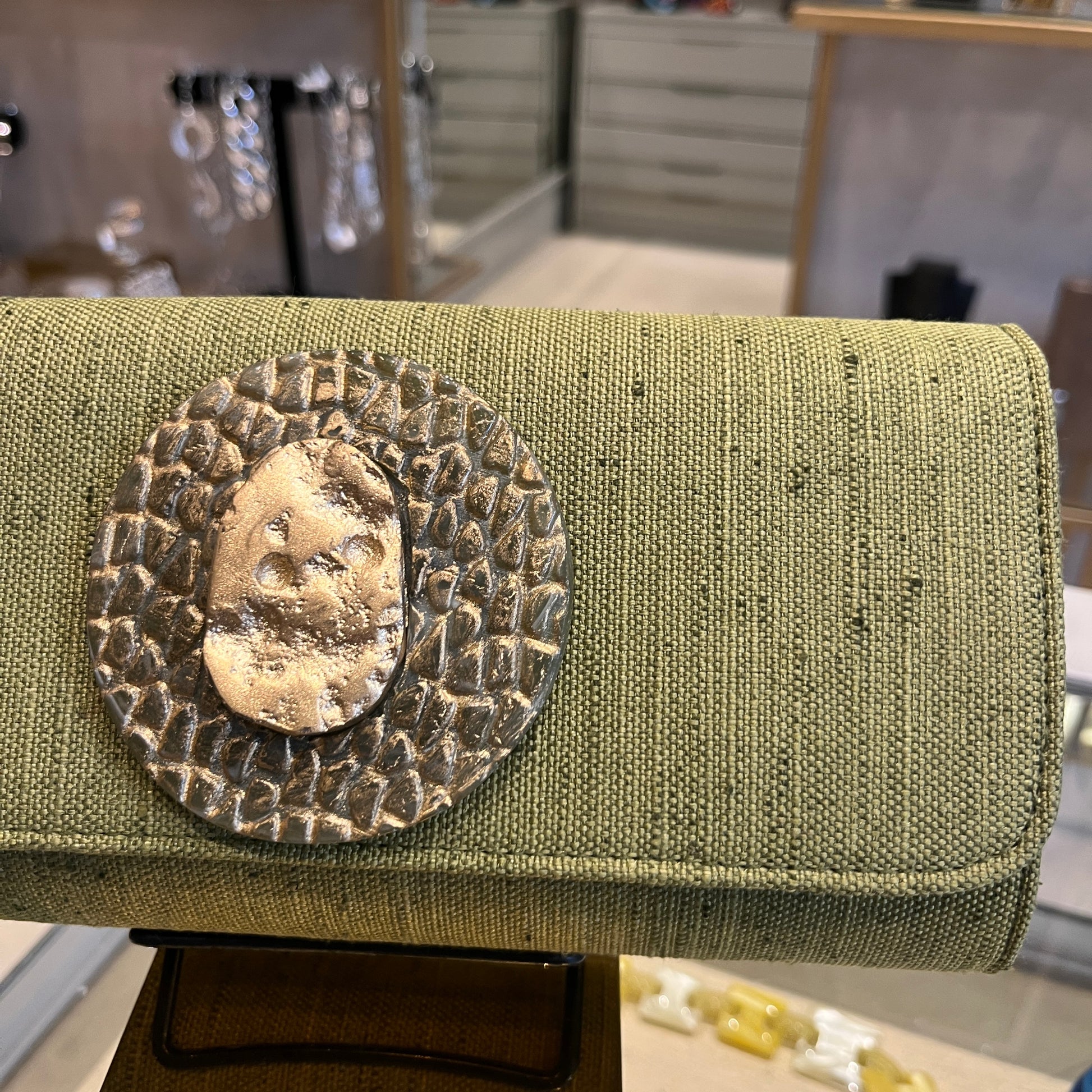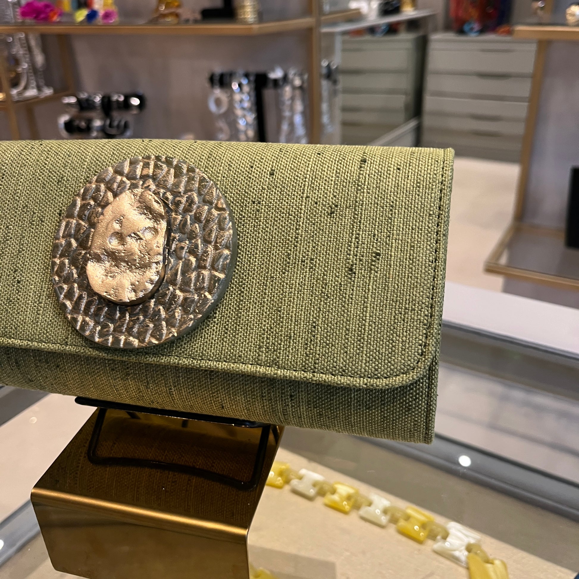 Sobre hecho artesanalmente en la India, en tela tipo tejida color verde con aplique central dorado.